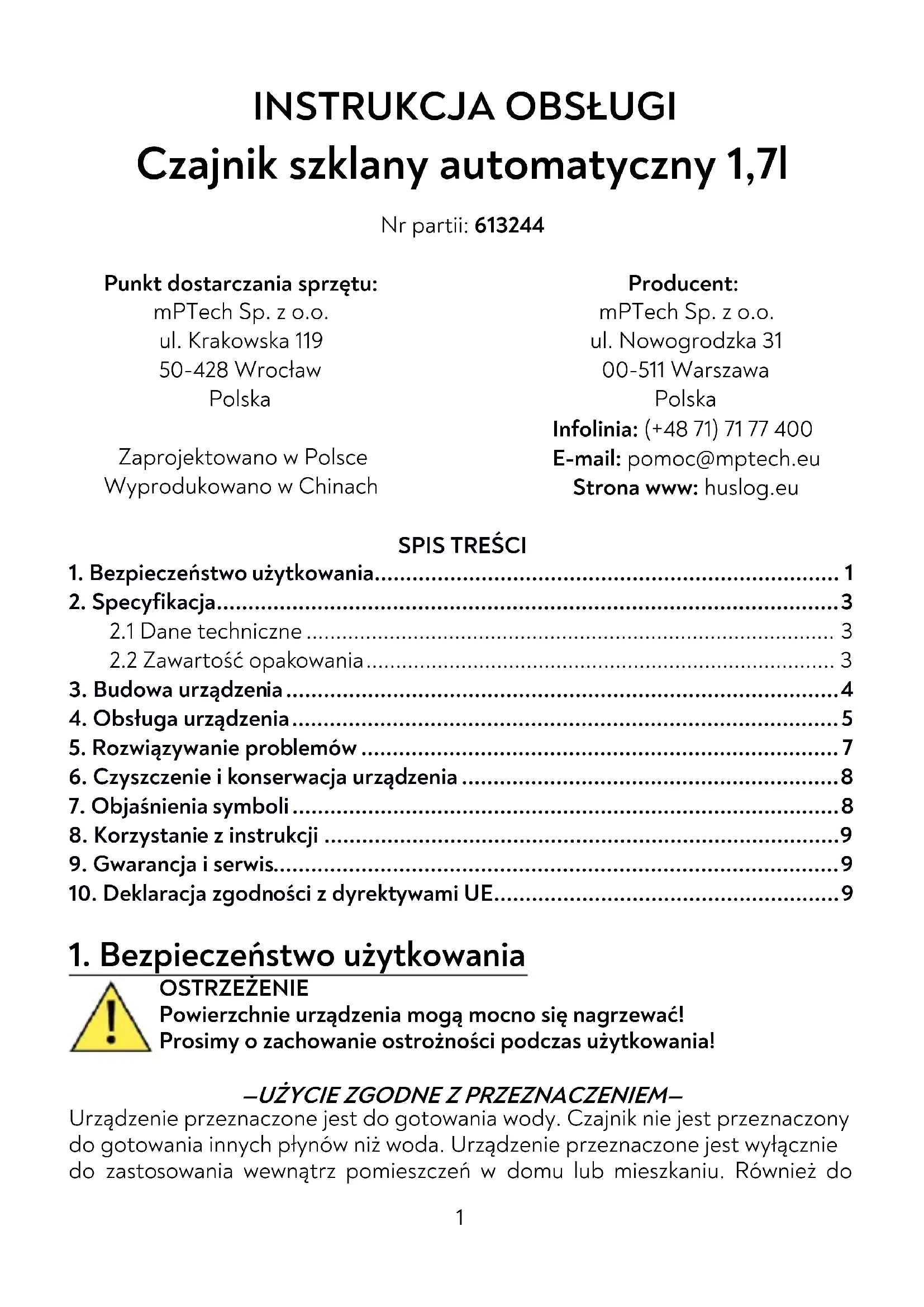 Bouilloire automatique en verre 1,7 l Numéro de lot : 613244 Point de livraison d’équipement : mPTech Sp. z o.o. ul. Krakowska 119 50-428 Wrocław Pologne Conçu en Pologne Fabriqué en Chine Fabricant : mPTech Sp. z o.o. ul. Nowogrodzka 31 00-511 Warszawa Pologne Ligne d’assistance : (+48 71) 71 77 400 Courriel : pomoc@mptech.eu Site web : huslog.eu