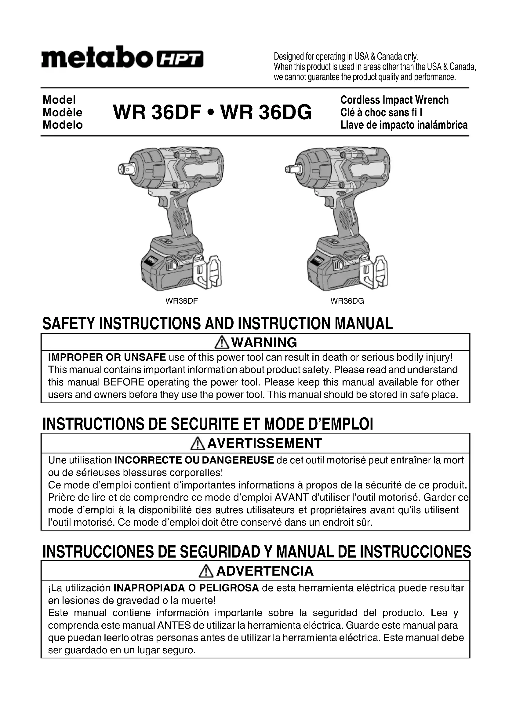 English 000BookWR36DF.indb25000BookWR36DF.indb25 2022/09/0117:22:442022/09/0117:22:44CONSIGNES DE SÉCURITÉ IMPORTANTES Lire et comprendre toutes les précautions de sécurité, les avertissements et les instructions de fonctionnement dans ce mode d’emploi avant d’utiliser ou d’entretenir cet outil motorisé. La plupart des accidents causés lors de l’utilisation ou de l’entretien de l’outil motorisé proviennent d’un non respect des règles ou précautions de base de sécurité. Un accident peut la plupart du temps être évité si l’on reconnaît une situation de danger potentiel avant qu’elle ne se produise, et en observant les procédures de sécurité appropriées. Les précautions de base de sécurité sont mises en évidence dans la section “SECURITE” de ce mode d’emploi et dans les sections qui contiennent les instructions de fonctionnement et d’entretien. Les dangers qui doivent être évités pour prévenir des blessures corporelles ou un endommagement de la machine sont identifi és par AVERTISSEMENTS sur l’outil motorisé et dans ce mode d’emploi. NE JAMAIS utiliser cet outil motorisé d’une manière qui n’est pas spécifi quement recommandée par metabo HPT.