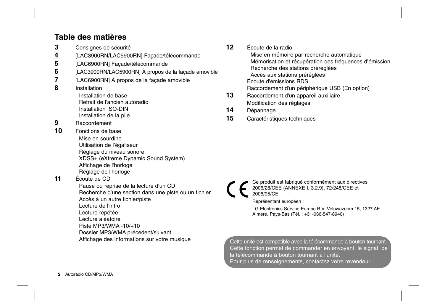 Écoute de la radio Mise en mémoire par recherche automatique Mémorisation et récupération des fréquences d’émission Recherche des stations préréglées Accès aux stations préréglées Écoute d'émissions RDS Raccordement d'un périphérique USB (En option) Raccordement d'un appareil auxiliaire Modification des réglages Dépannage Caractéristiques techniques Ce produit est fabriqué conformément aux directives 2006/28/CEE (ANNEXE I, 3.2.9), 72/245/CEE et 2006/95/CE. Représentant européen : LG Electronics Service Europe B.V. Veluwezoom 15, 1327 AE Almere, Pays-Bas (Tél. : +31-036-547-8940) Cette unité est compatible avec la télécommande à bouton tournant. Cette fonction permet de commander en envoyant le signal de la télécommande à bouton tournant à l'unité. Pour plus de renseignements, contactez votre revendeur . Consignes de sécurité ATTENTION