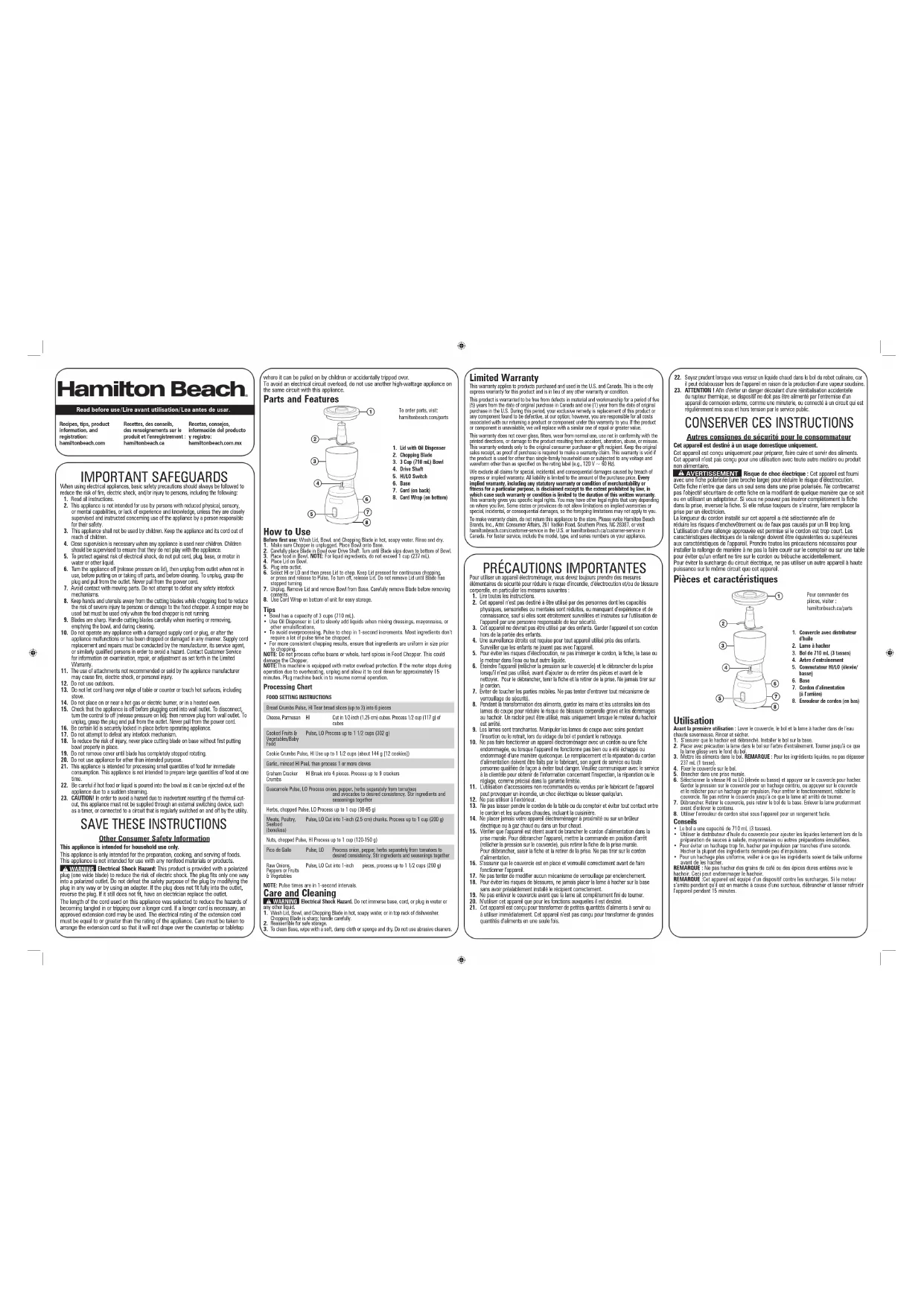 - Utiliser le distributeur d’huile du couvercle pour ajouter les liquides lentement lors de la préparation de sauces à salade, mayonnaises ou autres préparations émulsifiées.• Pour éviter un hachage trop fin, hacher par impulsion par tranches d’une seconde. Hacher la plupart des ingrédients demande peu d’impulsions.• Pour un hachage plus uniforme, veiller à ce que les ingrédients soient de taille uniforme avant de les hacher.REMARQUE : Ne pas hacher des grains de café ou des épices dures entières avec le hachoir. Ceci peut endommager le hachoir.REMARQUE :Cet appareil est équipé d’un dispositif contre les surcharges. Si le moteur s’arrête pendant qu’il est en marche à cause d’une surchaue, débrancher et laisser refroidir l’appareil pendant 15 minutes.840373401| A3 - 11.7 x 16.5 in 4/24Modelo: Tipo: Características eléctricas: 72890 FC16 120 V ~ 60 Hz 350 W Los modelos incluídos en el instructivo de Uso y cuidado pueden ir seguidos o no por un sufijo correspondiente a una o varias letras del alfabeto y sus combinaciones, separadas o no por un espacio, coma, diagonal, o guión. Como ejemplos los sufijos pueden ser: “Y” y/o “MX” y/o “MXY” y/o “Z”.Grupo HB/PS, S.A. de C.V.Monte Elbruz No. 124 - 401Col. Polanco V Sección, Miguel HidalgoCiudad de México, C.P. 11560GARANTÍA PARA PRODUCTOS COMPRADOS EN MÉXICOPRODUCTO: MARCA: MODELO:Grupo HB/PS, S.A. de C.V. cuenta con una Red de Centros de Servicio Autorizada, por favor consulte en la lista anexa el nombre y dirección de los establecimientos en la República Mexicana en donde usted podrá hacer efectiva la garantía, obtener partes, componentes, consumibles y accesorios; así como también obtener servicio para productos fuera de garantía. Para mayor información llame al: Centro de Atención al Consumidor: 800 71 16 100 Grupo HB/PS, S.A. de C.V. le otorga a partir de la fecha de compra:GARANTÍA DE 1 AÑO.COBERTURA• Esta garantía ampara, todas las piezas y componentes del producto que resulten con defecto de fabricación incluyendo la mano de obra.• Grupo HB/PS, S.A. de C.V. se obliga a reemplazar, reparar o reponer, cualquier pieza o componente defectuoso; proporcionar la mano de obra necesaria para su diagnóstico y reparación, todo lo anterior sin costo adicional para el consumidor.• Esta garantía incluye los gastos de transportación del producto que deriven de su cumplimiento dentro de su red de servicio.LIMITACIONES• Esta garantía no ampara el reemplazo de piezas deterioradas por uso o por desgaste normal, como son: cuchillas, vasos, jarras, filtros, etc.• Grupo HB/PS, S.A. de C.V. no se hace responsable por los accidentes producidos a consecuencia de una instalación eléctrica defectuosa, ausencia de toma de tierra, clavija o enchufe en mal estado, etc.EXCEPCIONESEsta garantía no será efectiva en los siguientes casos:a) Cuando el producto se hubiese utlizado en condiciones distintas a las normales. (Uso industrial, semi-industrial o comercial.)b) Cuando el producto no hubiese sido operado de acuerdo con el instructivo de uso.c) Cuando el producto hubiese sido alterado o reparado por personas no autorizadas por Grupo HB/PS, S.A. de C.V. el fabricante nacional, importador o comercializador responsable respectivo.El consumidor puede solicitar que se haga efectiva la garantía ante la propia casa comercial donde adquirió su producto, siempre y cuando Grupo HB/PS, S.A. de C.V. no cuente con talleres de servicio.PROCEDIMIENTO PARA HACER EFECTIVA LA GARANTÍA• Para hacer efectiva la garantía, lleve su aparato al Centro de Servicio Autorizado más cercano a su domicilio (consulte la lista anexa).• Si no existe Centro de Servicio Autorizado en su localidad llame a nuestro Centro de Atención al Consumidor para recibir instrucciones de como hacer efectiva su garantía.FECHA DE ENTREGASELLO DEL VENDEDORQUEJAS Y SUGERENCIASDÍA___________ MES__________AÑO__________Si desea hacer comentarios o sugerencias con respecto a nuestro servicio o tiene alguna queja derivada de la atención recibida en alguno de nuestros Centros de Servicio Autorizados, por favor dirigirse a:GERENCIA INTERNACIONAL DE SERVICIO 800 71 16 100Email: mexico.service@hamiltonbeach.comCENTROS DE SERVICIO AUTORIZADOSCiudad de MéxicoELECTRODOMÉSTICOSAv. Plutarco Elias Calles No. 1499 Zacahuitzco, Benito Juárez, Ciudad de México, C.P. 09490 Tel: 55 5235 2323 CASA GARCÍA Av. Patriotismo No. 875-B Mixcoac, Benito Juárez, Ciudad de México, C.P. 03910 Tel: 55 5563 8723 Nuevo LeónFERNANDO SEPÚLVEDA REFACCIONESRuperto Martínez No. 238 Ote.Col. Centro Monterrey, N.L., C.P. 64000Tel: 81 8343 6700JaliscoSERVICIOS DE MANTENIMIENTO CASTILLOGaribaldi No. 1450, Ladrón de GuevaraGuadalajara, Jalisco, C.P. 44660Tel: 33 3825 3480 Tableau de transformation ALIMENTS RÉGLAGE INSTRUCTIONSMiettes de pain Pulser, HI (élevée)Briser les tranches de pain (jusqu’à 3) en 6 morceauxFromage, parmesanHI (élevée)Couper en cubes de 1.25 cm (1/2 po). Hacher 1.25 cm (1/2 tasse) de cubesFruits et légumes cuits ou aliments pour bébéPulser, LO (basse)Hacher jusqu’à 302 g (1 1/2 tasses)Miettes de biscuitsPulser, HI (élevée)Utiliser jusqu’à 144 g (environ 1 1/2 tasses [12 biscuits]) Ail, émincé HI (élevée) Peler, puis hacher 1 gousse ou plus Miettes de biscuits GrahamHI (élevée) Briser en 4 morceaux. Hacher jusqu’à 9 craquelinsGuacamole Pulser, LO (basse)Hacher les oignons, le poivron et les fines herbes à l’aide du hachoir séparément des tomates et des avocats jusqu’à l’obtention de la consistance souhaitée. Mélanger les ingrédients et les assaisonnements ensembleFines herbes, hachéesPulser, LO (basse)Hacher jusqu’à 30-65 g (1 tasse) Viande, volaille, fruits de mer (sans os)Pulser, LO (basse)Couper en morceaux de 1 po (2,5 cm). Hacher jusqu’à 200 g (1 tasse)Noix hachées Pulser, HI (élevée)Hacher jusqu’à 120-150 g (1 tasse) Pico de Gallo Pulser, LO (basse)Hacher les oignons, le