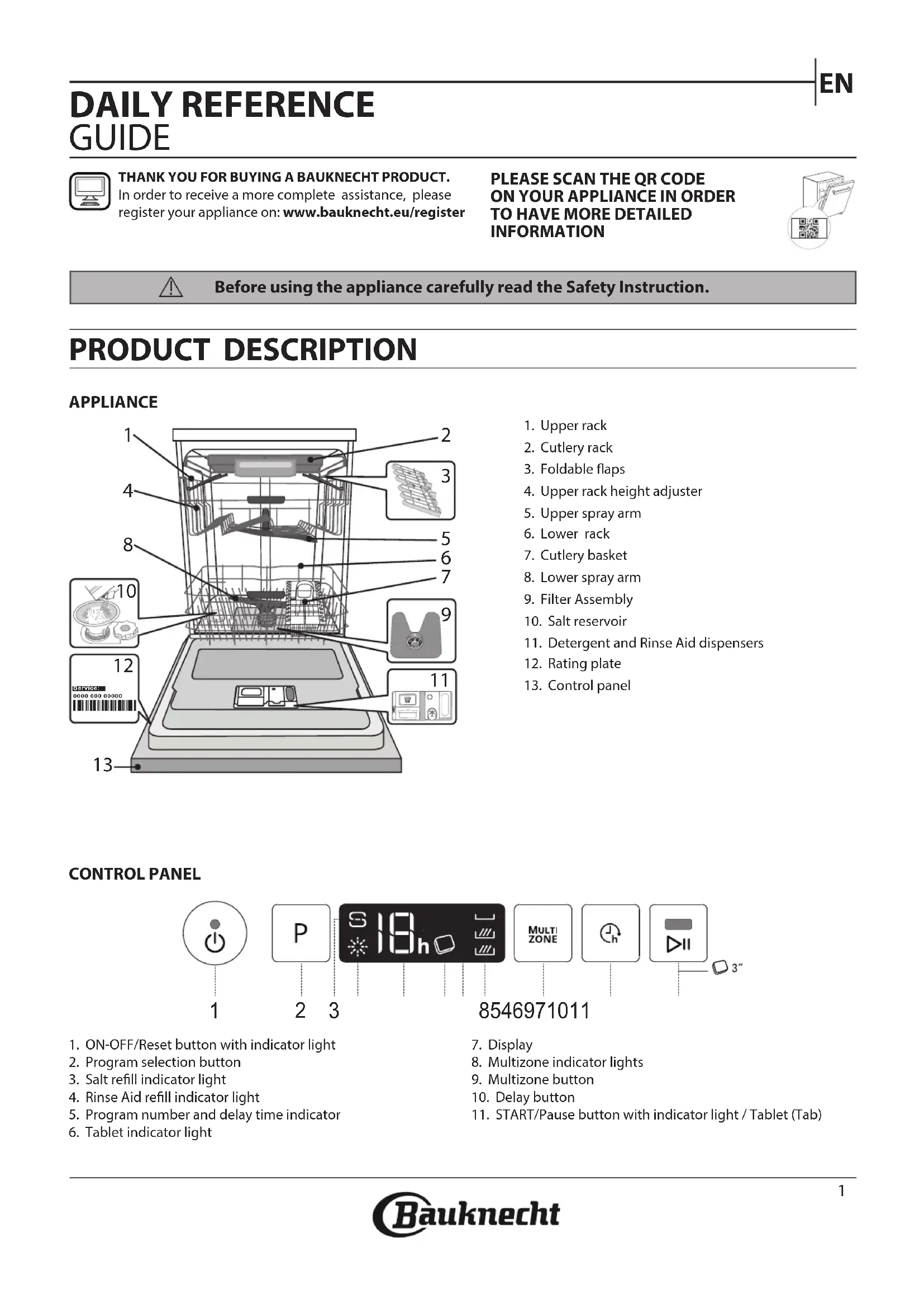 APPAREILPANNEAU DE COMMANDE1. Touche Marche-Arrêt/Réinitialisation avec le voyant2. Sélecteur de programme3. Voyant de niveau de sel4. Voyant de niveau de liquide de rinçage5. Voyant pour le numéro du programme et le retard réglage6. Voyant Pastille7. Achage8. Voyant Multizone9. Touche Multizone10. Touche Diéré11. Touche Départ/Pause avec le voyant / PastilleMERCI D’AVOIR CHOISI UN PRODUIT BAUKNECHT. Afin de recevoir une assistance plus complète, merci d’enregistrer votre appareil sur on: www.bauknecht.eu/register MERCI DE SCANNER LE QR CODE SUR VOTRE APPAREIL POUR OBTENIR DES INFORMATIONS PLUS DÉTAILLÉES.