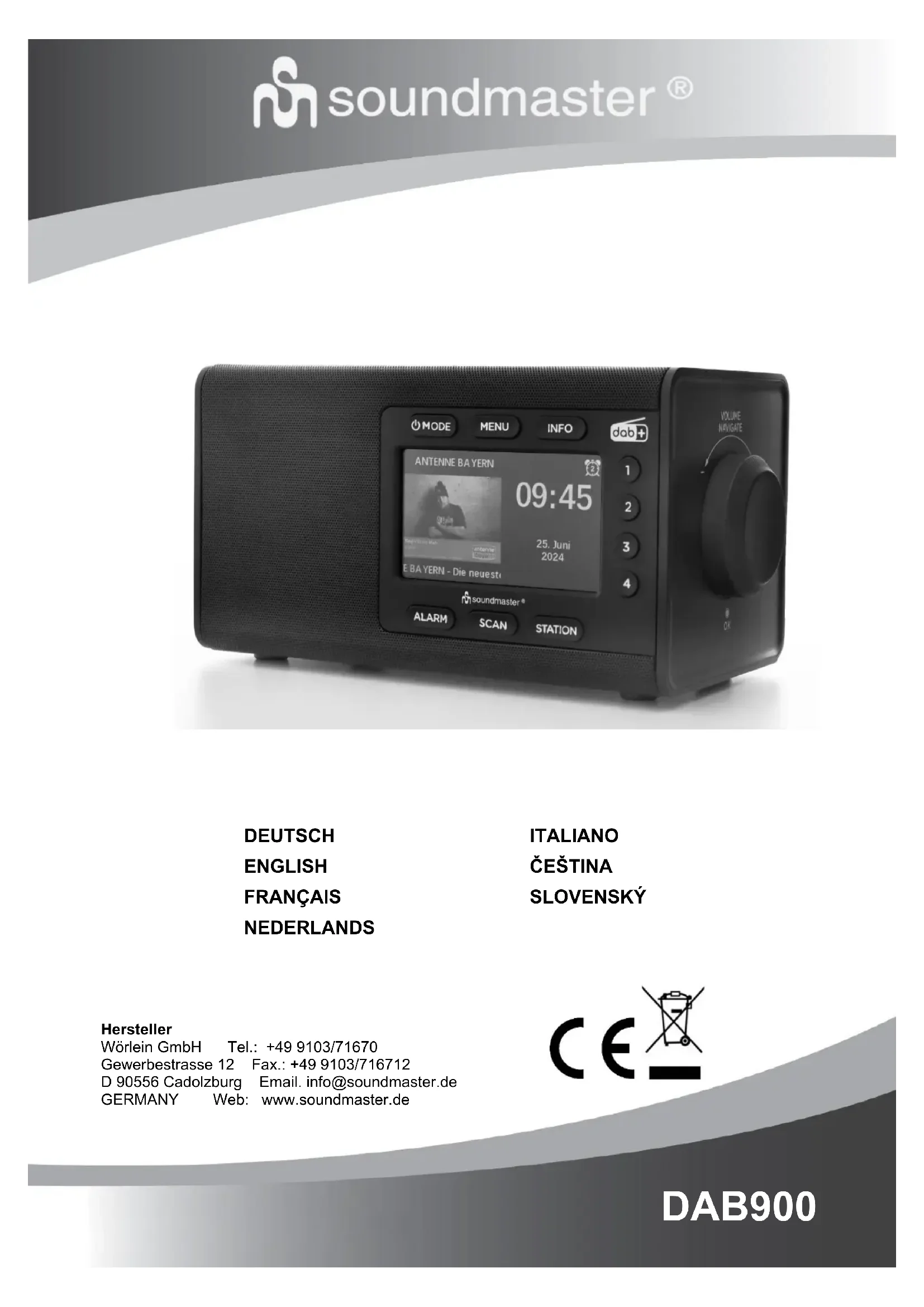 La version actuelle du manuel d’instructions peut être téléchargée à l’adresse www.soundmaster.de Modifications techniques et fautes d'impression réservées. Copyright de Wörlein GmbH, 90556 Cadolzburg, www.soundmaster.de Duplication uniquement avec l’autorisation de Woerlein GmbHVeiligheids-, milieu- en instellingsaanwijzingen