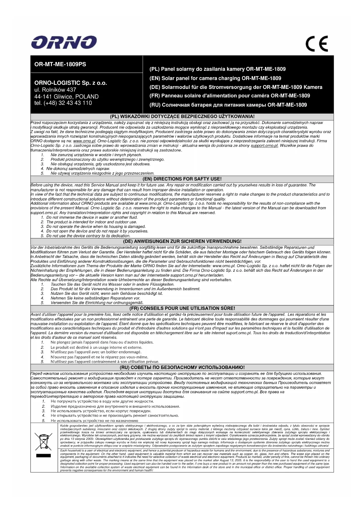 (FR) CONSEILS POUR UNE UTILISATION SÛRE! Avant d'utiliser l'appareil pour la première fois, lisez cette notice d'utilisation et gardez-la précieusement pour toute utilisation future de l'appareil. Les réparations et les modifications effectuées par un non professionnel entrainent une perte de garantie. Le fabricant décline toute responsabilité des dommages qui pourraient résulter d'une mauvaise installation ou exploitation de l'appareil. Étant donné que les spécifications techniques peuvent être modifiées, le fabricant se réserve le droit d'apporter des modifications aux caractéristiques techniques du produit et d'introduire d'autres solutions qui n'ont pas d'impact sur les paramètres techniques et la facilité d'utilisation de l'appareil. La dernière version du manuel d'utilisation est disponible en téléchargement libre sur le site internet suport.orno.pl. Tous les droits de traduction/d'interprétation et les droits d'auteur de ce manuel sont réservés.