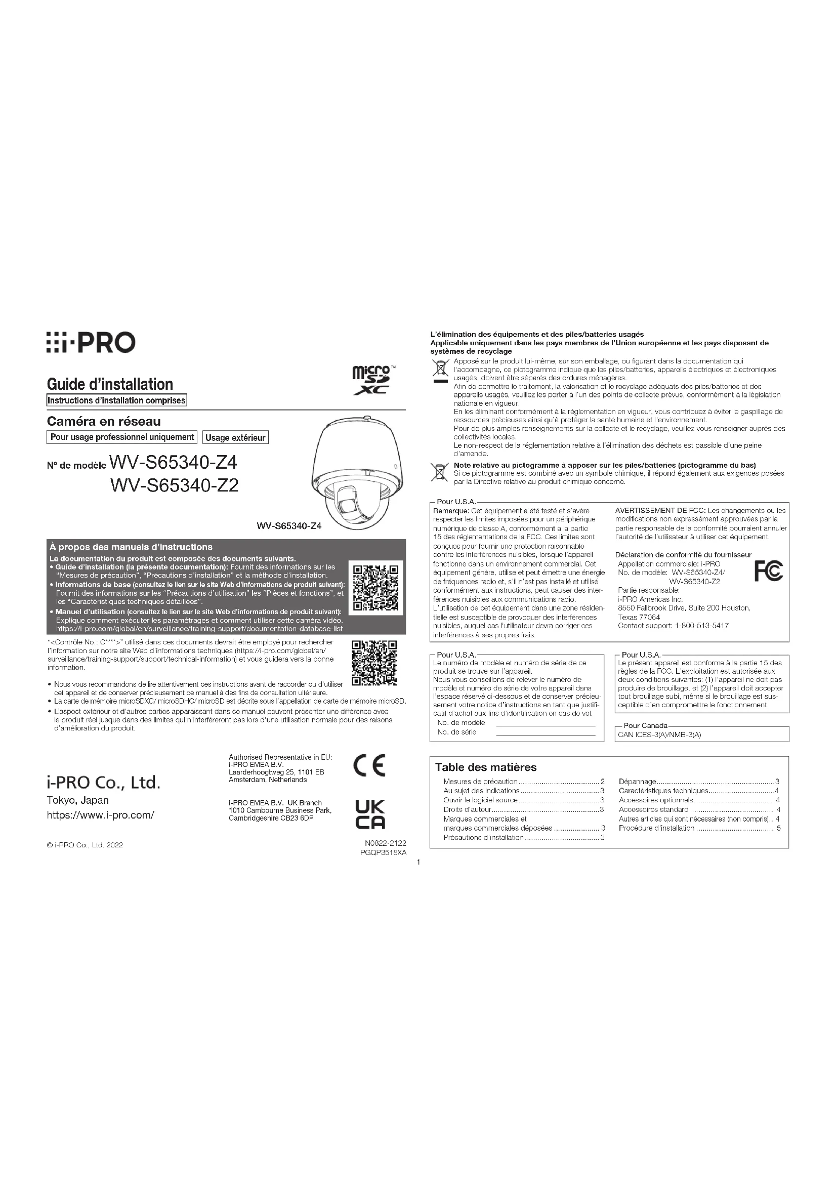 - L’aspect extérieur et d’autres parties apparaissant dans ce manuel peuvent présenter une différence avec le produit réel jusque dans des limites qui n’interféreront pas lors d’une utilisation normale pour des raisons d’amélioration du produit.N0822-2122PGQP3518XA© i-PRO Co., Ltd. 2022Nº de modèle WV-S65340-Z4 WV-S65340-Z2 CAN ICES-3(A)/NMB-3(A)Pour Canada Tokyo, Japan https://www.i-pro.com/ Authorised Representative in EU:i-PRO EMEA B.V.Laarderhoogtweg 25, 1101 EB Amsterdam, Netherlandsi-PRO EMEA B.V. UK Branch1010 Cambourne Business Park, Cambridgeshire CB23 6DP2 Mesures de précaution ■ Ne pas introduire d’objets étrangers dans le produit. Une déclaration de feu ou une décharge électrique peut s’ensuivre si de l’eau ou tous corps étrangers, tels que des objets métalliques, pénètrent à l’intérieur de l’appareil. Couper immédiatement l’alimentation de la caméra vidéo et demander à un dépanneur professionnel de la vérifier. ■ Ne pas exposer ce produit à dans une atmosphère en présence de produit inflammable. Le fait de ne pas respecter cette recommandation risque de provoquer une explosion et de blesser quelqu’un. ■ Éviter d’installer ce produit dans des emplacements où des dégâts par le sel se produisent ou du gaz corrosif est produit. Dans le cas contraire, les parties servant à l’installation se détérioreront et des blessures ou des accidents dus à une chute de ce produit peuvent se produire. ■ Ne pas frapper ni soumettre ce produit à des chocs violents. Le fait de ne pas respecter cette recommandation risque d’aboutir à des blessures ou à un incendie. ■ Conserver les cartes de mémoire microSD hors de la portée des enfants en bas âge et des enfants. Sinon, ils peuvent avaler les cartes par erreur. Si le cas se produit, consulter immédiatement un médecin. ■ Ne pas se suspendre à partir de ce produit ni utiliser ce produit comme piédestal. Le fait de ne pas respecter cette recommandation risque d’aboutir à des blessures voire provoquer des accidents. ■ Ne pas endommager le câble d’alimentation. Ne pas endommager, transformer, tordre, étirer, lier ou plier en force le câble d’alimentation. Ne placer aucun objet lourd dessus et le conserver loin des sources de chaleur. L’utilisation du câble d’alimentation endommagé peut provoquer une décharge électrique, un court-circuit ou un incendie. Se mettre en rapport avec le distributeur en ce qui concerne la réparation. ■ Ne pas installer ce produit à un endroit fortement influencé par le vent. L’installation à un endroit où la vitesse du vent est de 60 m/s {environ 134 mph} ou plus risque de causer une chute du produit ayant pour résultat de provoquer des blessures ou des accidents. ■ Ne pas éclabousser plus d’eau, dépassant les performances d’imperméabilité à l’eau de ce produit en utilisant une machine de nettoyage à haute pression, etc. Un incendie ou une décharge électrique peut être provoquée par immersion. ■ Ne jamais chercher à démonter ni modifier ce produit. Cela pourrait provoquer un incendie, un choc électrique, etc. Confiez la réparation et l’inspection à votre revendeur.