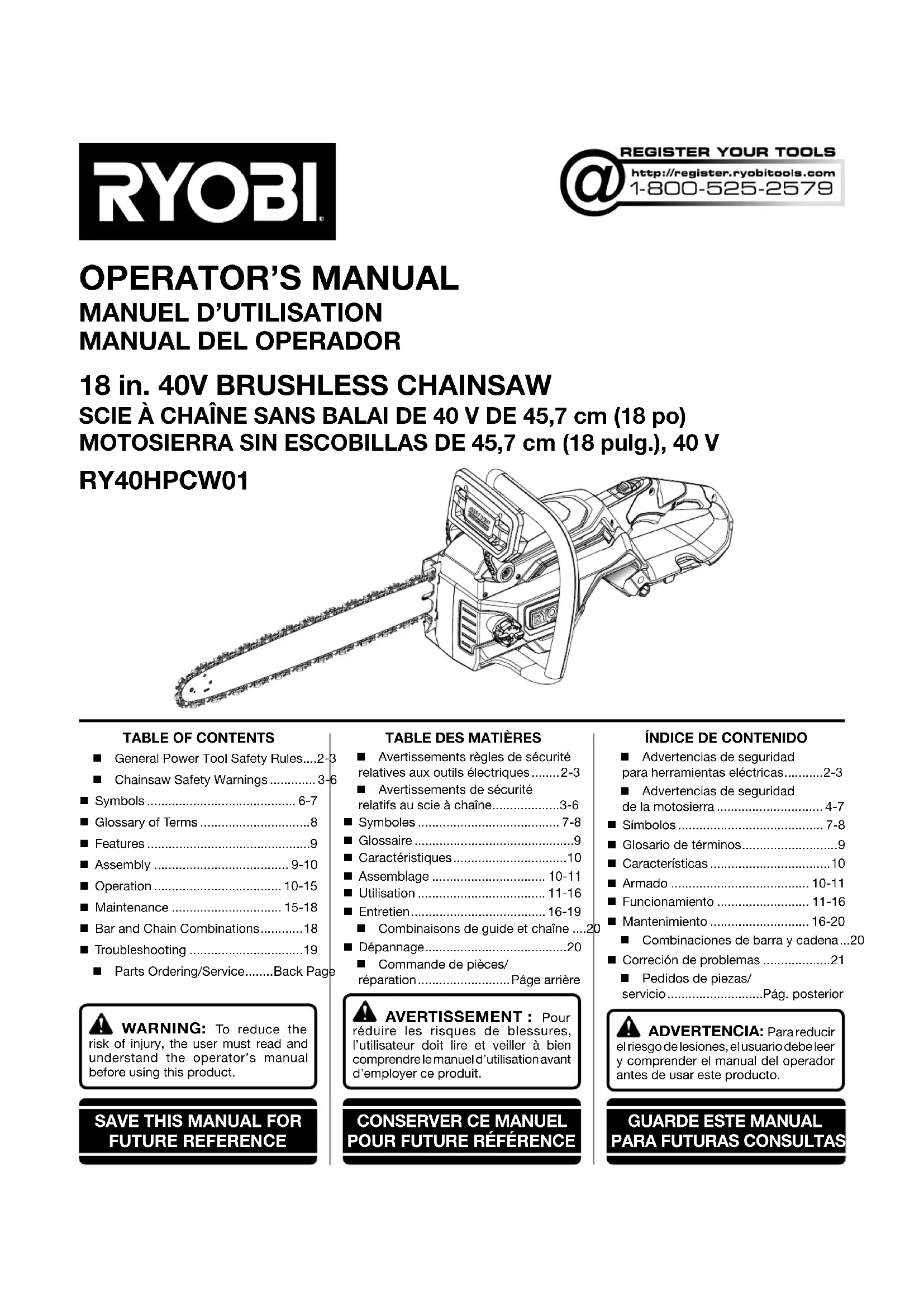 Pour toute question concernant l’utilisation ou l’entretien utiliser ce produit, appeler le service d’assistance téléphonique RYOBI !Votre produit a été complètement testé avant la livraison pour nous assurer de votre entière satisfaction. Ce produit est accompagné d’une garantie limitée de cinq (5) ans pour utilisation personnel, familiales ou domestiques (90 jours pour utilisation affaires ou commerciaux). Pour obtenir les détails de la garantie, visiter le site www.ryobitools.com ou appeler (sans frais) au 1-800-525-2579.