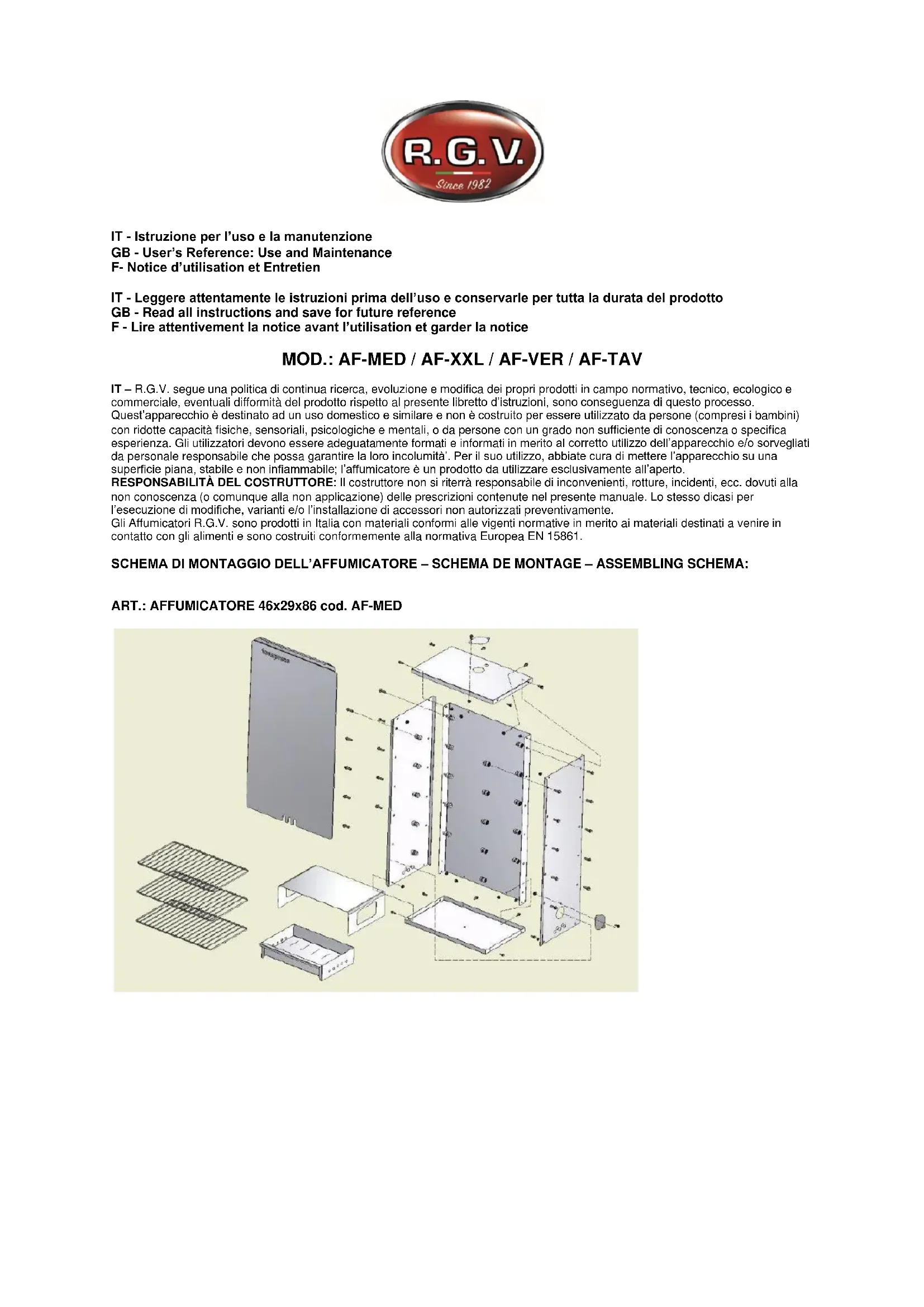 Fumoir en kit d’assemblage 46x29x86 cm. mod. AF-MED Fumoir XXL en kit d’assemblage 51x41x96 cm. mod. AF-XXL Fumoir Verticale en kit d’assemblage 26x21x100 cm. mod. AF-VER – Grilles non fournies ; disponibles en option Fumoir en kit d’assemblage mod. AF-TAV Avertissement R.G.V. suit une politique de recherche et d’amélioration constante de ses produits par rapport aux normes de sécurité, à la technique, à l'écologie et aux contraintes commerciales. Les éventuelles différences entre nos produits et cette notice ne seraient que la conséquence de ce processus. Cet appareil est destiné à une utilisation domestique et analogue. Il n’est pas prévu pour être utilisé par des personnes (y compris les enfants) dont les capacités physiques, sensorielles ou mentales sont réduites, ou des personnes dénuées d’expérience ou de connaissance, sauf si elles ont pu bénéficier, par l’intermédiaire d’une personne responsable de leur sécurité, d’une surveillance ou d’instructions préalables concernant l’utilisation de l’appareil. Toujours placer l’appareil sur une surface plane et éviter les positions pouvant entraîner la chute de l’appareil. RESPONSABILITE DU CONSTRUCTEUR : Le constructeur n’est pas responsable des dommages dus à une mauvaise utilisation de l'appareil, à la méconnaissance ou au non-respect des prescriptions consignés dans cette notice. Les Fumoirs R.G.V. sont produits en Italie avec des matériaux conformes aux normes concernant les appareils en contact avec les aliments. Ils sont construits conformément aux exigences de la norme européenne EN 15861. LE FUMOIR : Votre fumoir est soigneusement emballé et les éléments en acier inox sont couverts de film adhésif de protection anti-rayures. Lors du montage, décollez le film de protection des parties qui seront recouvertes mais laissez-le sur les surfaces qui ne seront pas recouvertes. Elles resteront protégées pendant le montage. Une fois votre fumoir entièrement assemblé, retirez le film en tirant lentement vers le bas. ATTENTION ! En retirant le film avant que votre fumoir ne soit entièrement assemblé, vous risquez de déformer les panneaux; utiliser toujours des gants pendant le montage et la manipulation. Composition AF-MED: Panneau arrière, flanc droit et gauche, fond, chapeau, 2 évents, porte coulissante verticale, 5 crochets, 3 grilles, tiroir et couvre-tiroir en acier inox, 1 Kg. de sciure, vis, boulons et clé de montage. AF-XXL : idem AF-MED + 3 barres à suspendre le produit et 2 poignées de transport. AF-VER : idem AF-MED mais sans grilles (les grilles sont fournì sur demande) + 1 barre à suspendre le produit. AF-TAV : Panneau arrière, flanc droit et gauche, fond, chapeau, 2 évents, porte coulissante verticale, 1 grille, tiroir et couvre-tiroir en acier inox, 1 Kg. de sciure, vis, boulons et clé de montage. La sciure R.G.V. est produite à partir du bois de hêtre et chêne pressé, certifié bois vierge ne contient aucune substance dangereuse. La sciure de bois est un produit susceptible de variation de poids à cause de l’humidité. UTILISATION : Fumage à chaud – fumage à froid On entend par fumer à chaud, l’action de cuire dans la fumée. Il faut alors considérer votre fumoir traditionnel R.G.V comme un four dont on élève la température avec des braises. Les cuissons fumées ne se pratiquent pas à très haute température. On joue davantage sur le temps d’exposition à la chaleur que sur la température elle-même. Pour le fumage à froid, il convient d’exposer l’aliment à la fumée sans le cuire. L’utilisation de l’accessoire "fumée froide" (sur demande) permet de limiter l'augmentation de la température dans le fumoir en plaçant le tiroir à braises à l’extérieur. ATTENTION !! Pour le fonctionnement correct de l’accessoire « fumée froide » il est nécessaire de limiter la quantité de braises et de sciure ; le temps de fonctionnement de la résistance 115407 (sur demande) ne doit pas dépasser 5 min. pour éviter d’échauffer excessivement la fumée. Les fumoirs AF-XXL et AF-VER sont équipées de barres pour suspendre les produits à fumer. Ils peuvent être utilisés verticalement et horizontalement pour fumer à plat. Les Braises Que ce soit pour fumer à chaud ou à froid, il est nécessaire d’allumer du charbon de bois comme vous le feriez pour un barbecue. Ce sont des braises qui vont permettre une combustion "couvée" de la sciure qui produit la fumée. Une fois le charbon de bois rougeoyant, ne couvrez pas totalement de sciure, ménagez un passage d’air. Gardez votre fumoir fermé Tant que vous pouvez voir de la fumée sortir, il fonctionne, en l’ouvrant, vous perturbez le tirage sans pour autant attiser la combustion. Votre fumoir peut être utilisé comme barbecue Placez les aliments le plus proche possible du tiroir avec les braises et utilisez votre fumoir traditionnel comme un barbecue. En ajoutant de la sciure sur vos braises, vous grillez et vous obtenez le goût de la fumée en plus. AVERTISSEMENT SCIURE Attention aux sciures de récupération qui peuvent être souillées par les lubrifiants des machines-outils ou mélangées à certains résineux toxiques. La brisure nécessaire au fumage doit être absolument propre et exempte de tout polluant. La présence de sciure provenant d’agglomérés, de contreplaqués ou de bois reconstitués, même en toute petite quantité, peut être dangereuse en raison des colles et des traitements utilisés.AVERTISSEMENTS: - Le support de votre fumoir ne doit pas être inflammable - Ne jamais utiliser le fumoir près de matériaux inflammables - N’utiliser le fumoir qu’à l’air libre et à l’abri du vent - N’utiliser que de la sciure R.G.V. pour un fumage de qualité supérieure - Ne pas toucher ou transporter le fumoir lorsqu’il fonctionne, l’appareil peut être très chaud. - Protéger l’appareil de l’humidité et de la pluie ENTR
