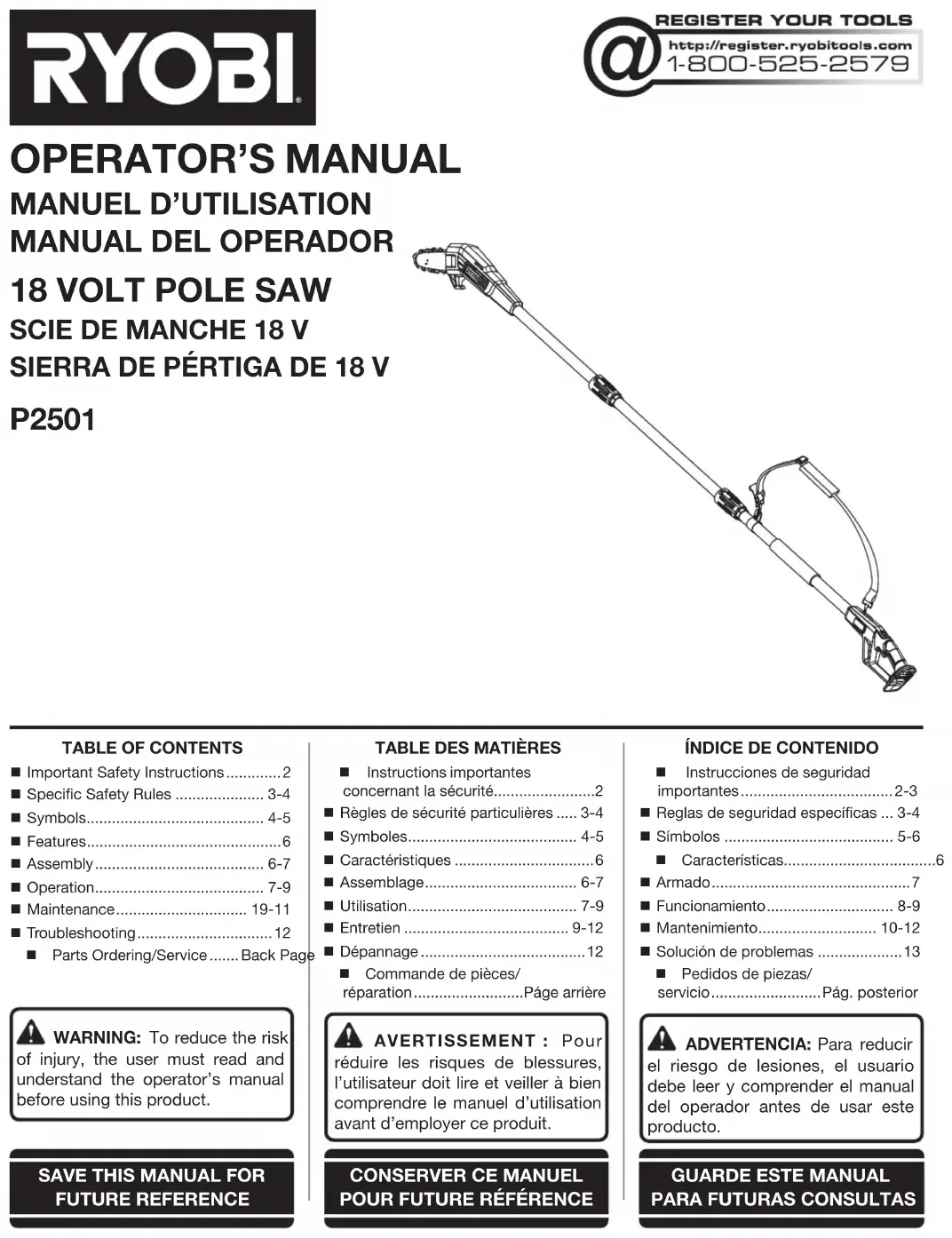 - Le numéro de modèle/article sur le produit peut contenir des lettres supplémentaires à la fin. Ces lettres désignent les informations du fabricant et doivent être fournies lors d’un appel de demande de service. COMMENT OBTENIR LES PIÈCES DE REMPLACEMENT : Les pièces de remplacement peuvent être achetées en ligne sur le site www.ryobitools.com ou par téléphone au 1-800-525-2579. Les pièces de remplacement peuvent être obtenues à un de nos centres de service. COMMENT TROUVER UN CENTRE DE SERVICE : Les centres de service peuvent être localisés en ligne au www.ryobitools.com ou en téléphonant au 1-800-525-2579. COMMENT OBTENIR DE L’AIDE EN CONTACTANT LE SERVICE À LA CLIENTÈLE : Pour contacter le service à la clientèle pour une question technique ou pour tout autre renseignement, veuillez nous téléphoner au 1-800-525-2579.RYOBI est une marque déposée de Ryobi Limited et est utilisée en vertu d’une licence accordée par Ryobi Limited.