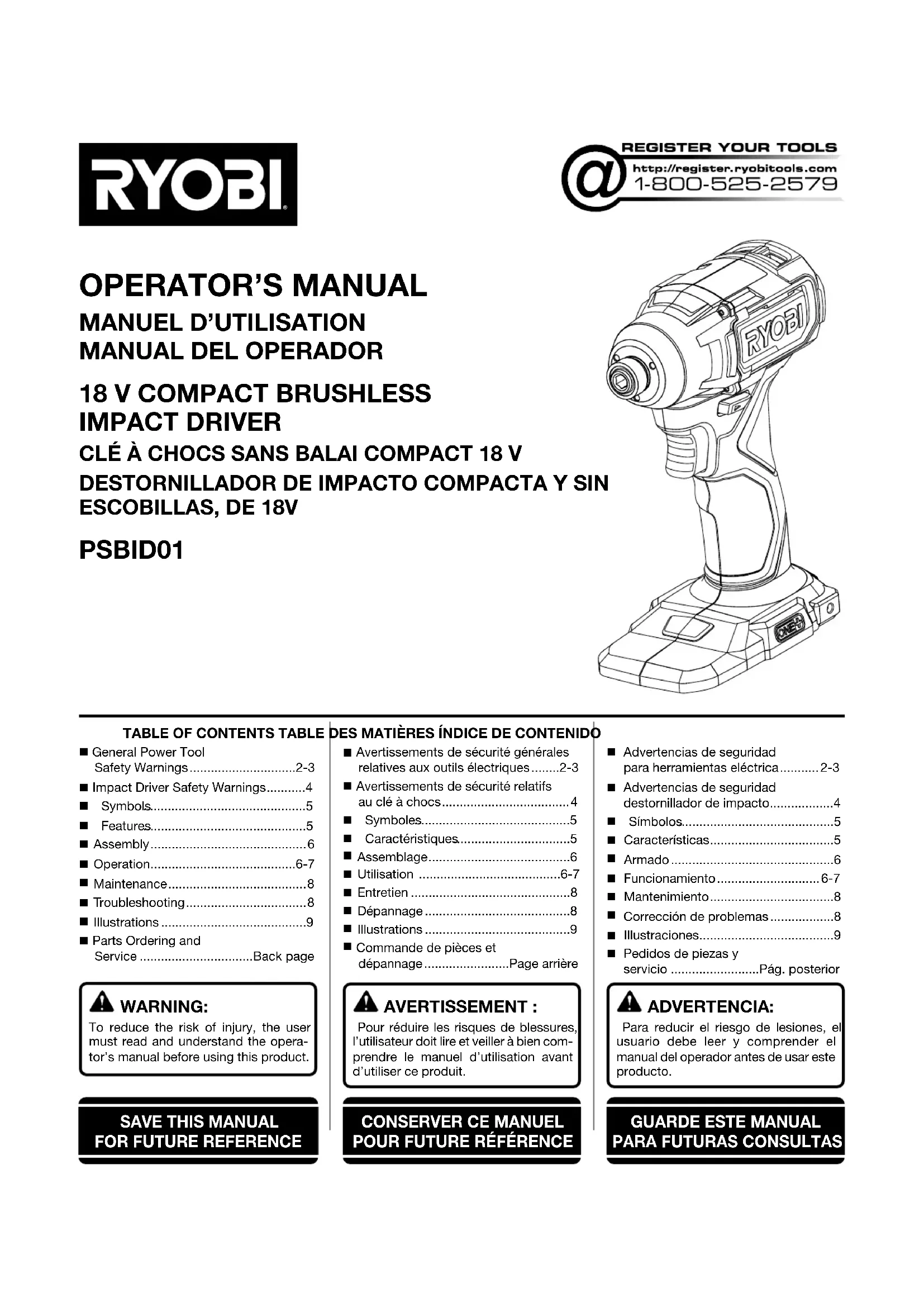 One+ PSBID01 - Visseuse RYOBI - Notice d'utilisation et mode d'emploi gratuit