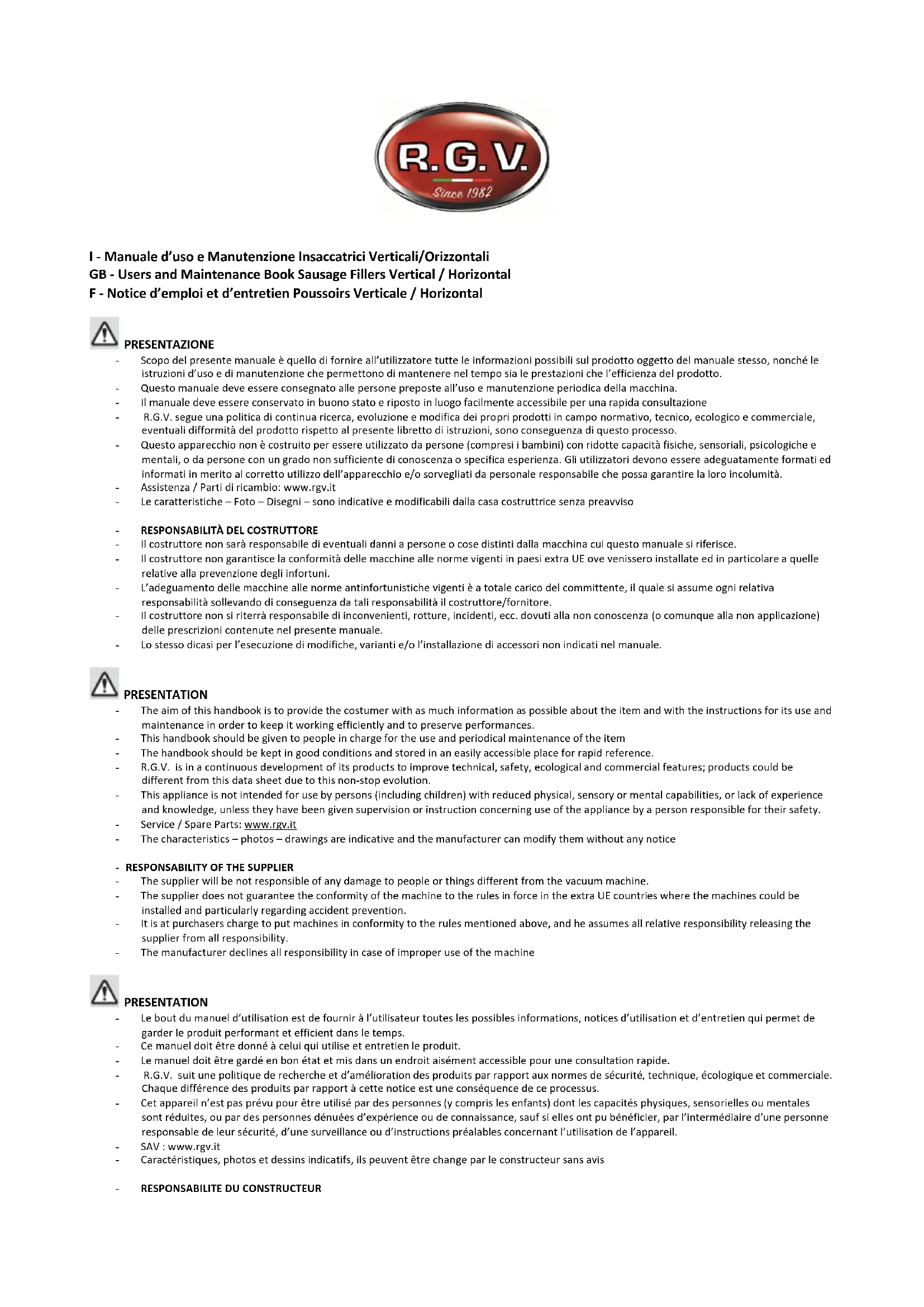 - The supplier will be not responsible of any damage to people or things different from the vacuum machine. - The supplier does not guarantee the conformity of the machine to the rules in force in the extra UE countries where the machines could be installed and particularly regarding accident prevention. - It is at purchasers charge to put machines in conformity to the rules mentioned above, and he assumes all relative responsibility releasing the supplier from all responsibility. - The manufacturer declines all responsibility in case of improper use of the machine PRESENTATION - Le bout du manuel d’utilisation est de fournir à l’utilisateur toutes les possibles informations, notices d’utilisation et d’entretien qui permet de garder le produit performant et efficient dans le temps. - Ce manuel doit être donné à celui qui utilise et entretien le produit. - Le manuel doit être gardé en bon état et mis dans un endroit aisément accessible pour une consultation rapide. - R.G.V. suit une politique de recherche et d’amélioration des produits par rapport aux normes de sécurité, technique, écologique et commerciale. Chaque différence des produits par rapport à cette notice est une conséquence de ce processus. - Cet appareil n’est pas prévu pour être utilisé par des personnes (y compris les enfants) dont les capacités physiques, sensorielles ou mentales sont réduites, ou par des personnes dénuées d’expérience ou de connaissance, sauf si elles ont pu bénéficier, par l’intermédiaire d’une personne responsable de leur sécurité, d’une surveillance ou d’instructions préalables concernant l’utilisation de l’appareil. - SAV : www.rgv.it - Caractéristiques, photos et dessins indicatifs, ils peuvent être change par le constructeur sans avis - RESPONSABILITE DU CONSTRUCTEUR- Le constructeur n’est pas responsable en cas de défaut ou d'endommagement dû au non connaissance ou à la non-application des conseils de cette notice, y compris l’utilisation non conforme et les éventuelles modifications et/ou l’installation d’accessoires non prévu par le constructeur même - Le constructeur ne garanties pas la conformité des machines aux normes des pays extra CEE où les machines peuvent être installées, particulièrement aux normes faisant référence à la prévention des accidents du travail. - L’ajustement des machines aux normes de prévention des accidents du travail est à la charge de l’acheteur qui soulève le constructeur/fournisseur de cette responsabilité.