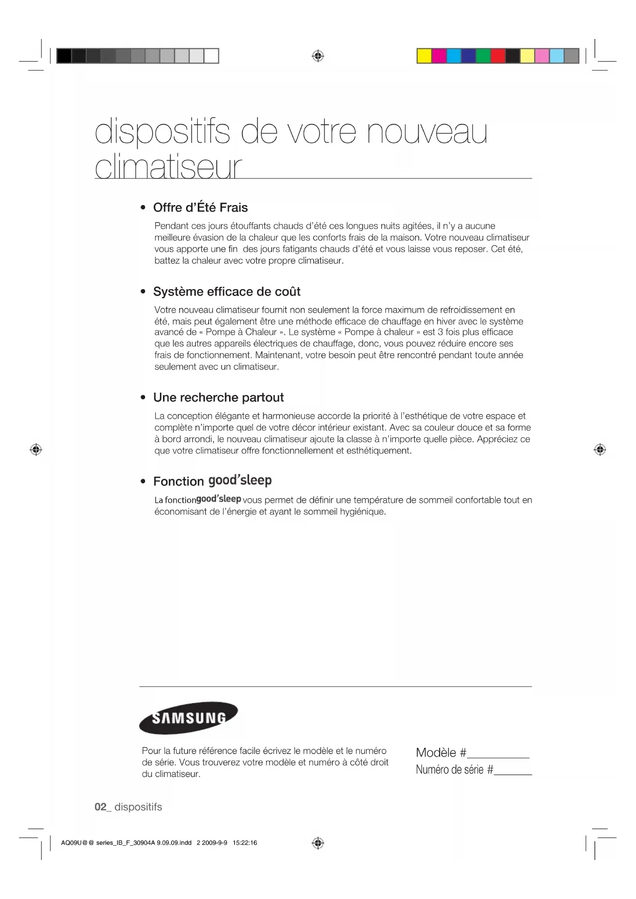 - Fonction La fonction vous permet de définir une température de sommeil confortable tout en économisant de l’énergie et ayant le sommeil hygiénique. AQ09U@@ series_IB_F_30904A 9.09.09.indd 2 2009-9-9 15:22:16information de sûreté _03FRANÇAIS information de sûreté Pour empêcher la décharge électrique, débranchez le courant avant d’entretenir, nettoyer, et installer l’unité.