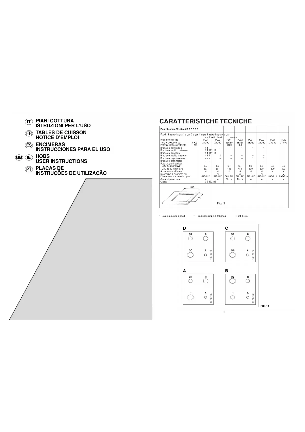 Référence de modéle PL01 PL02 PL01 PL02 PL01 PL02 PL01 PL02 Alimentation (V/Hz) 230/50 230/50 230/50 230/50 230/50 230/50 230/50 230/50 Puissance électr. (W) – – 1400 1400 –––– Brûleur semi-rapide 1 1 – – 1111Brûleur rapide arriére 1 1 1 1 1111Petit brûleur 1 1 1 1 1111Brûleur rapide avant 1 1 1 1 ––––Double brûleur – – – – ––11Grand brûleur – – – – 11––Puissance gaz installé: - gaz naturel (G20/20 mbar) kW** 8,2 8,2 6,7 6,7 8,6 8,6 8,6 8,6 - gaz butane (G30/28-30 mbar) g/h 597 597 488 488 620 620 620 620 Allumage électronique* oui oui oui oui oui oui oui oui Sécurité gaz – oui – oui – oui – oui Dimension appareil (l x p) mm. 595x510 595x510 595x510 595x510 595x510 595x510 595x510 595x510 Degré de protection – – Type Y Type Y –––– Classe 3 3 3 3 3333 Fig. 1 Fig. 1b