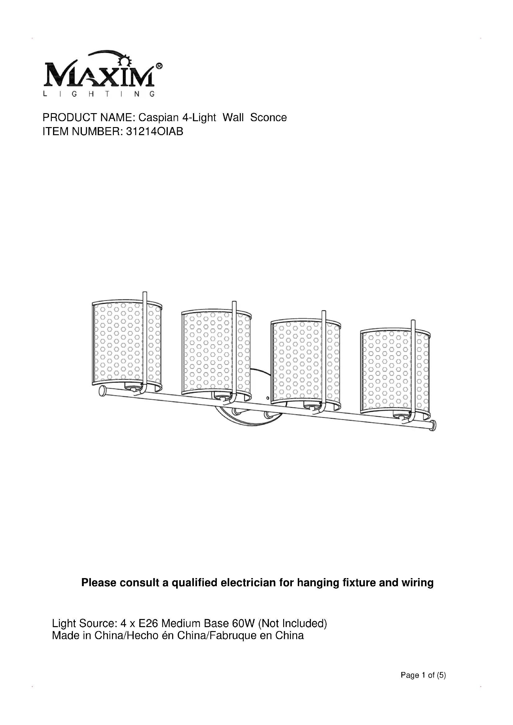 Caspian 31214OIAB - Éclairage Maxim - Notice d'utilisation et mode d'emploi gratuit