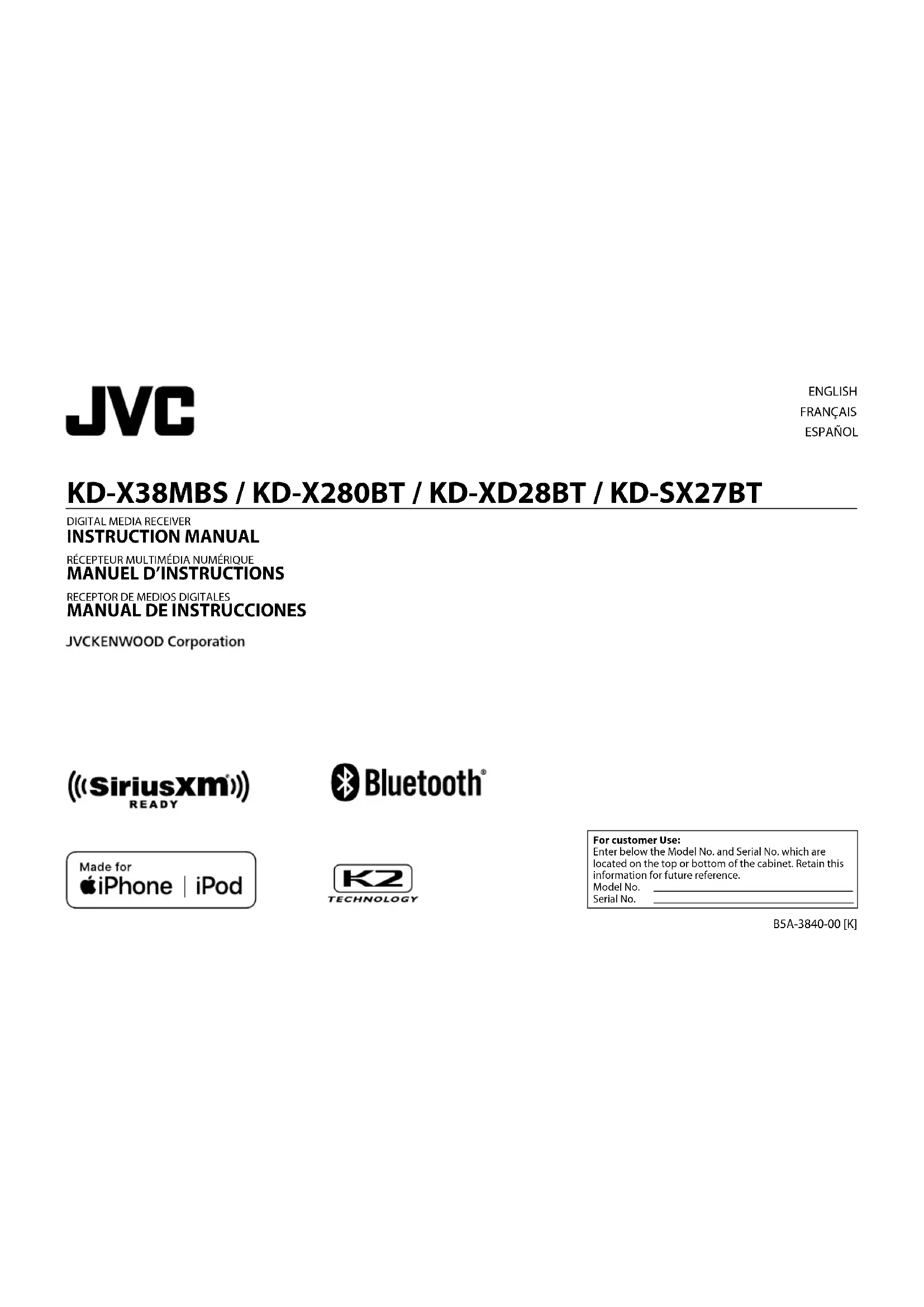 Retrouvez gratuitement la notice de l'appareil KD-XD28BT JVC au format PDF.
