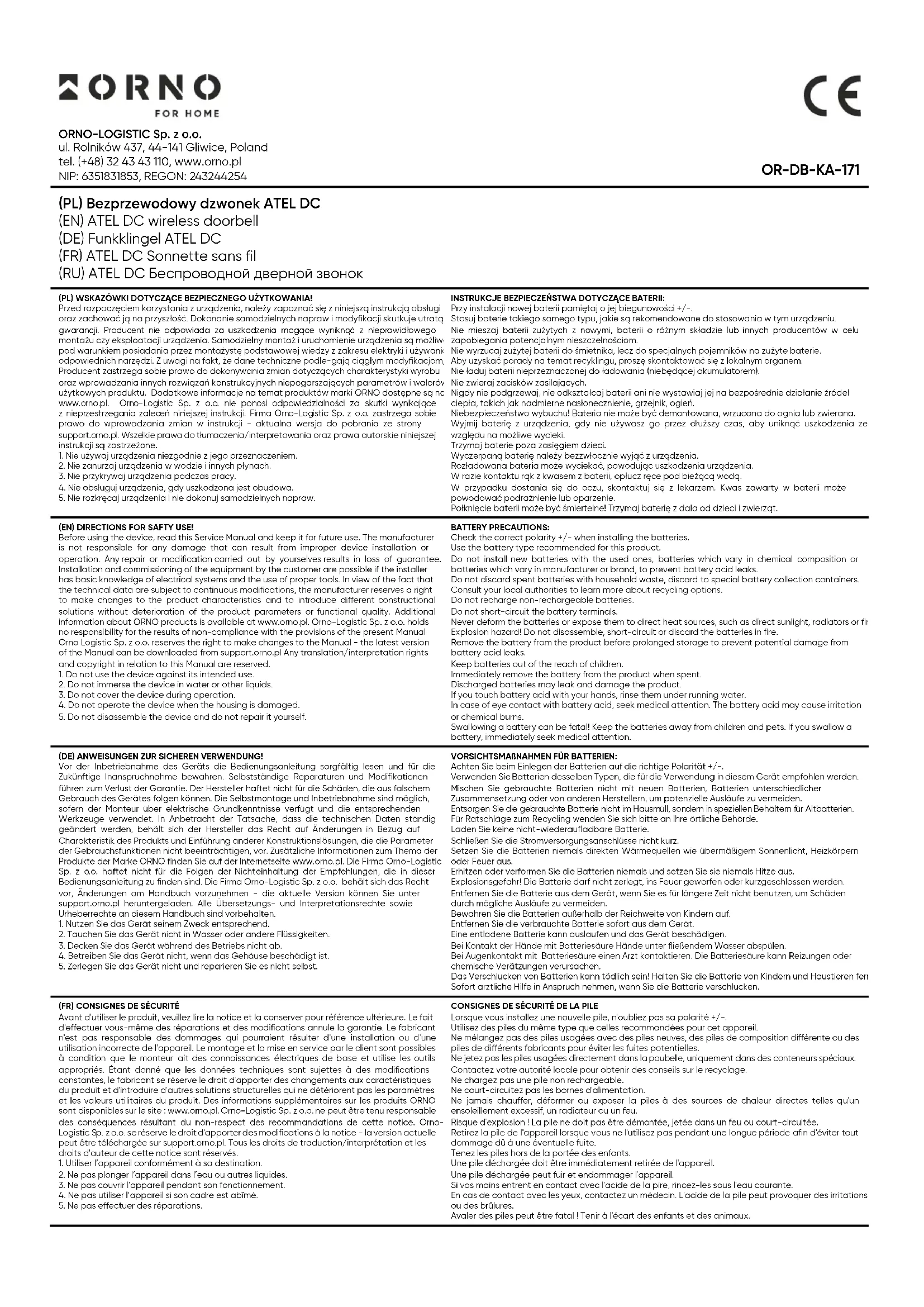 ♫ ca. 20 Sekunden lang gedrückt, bis Sie einen "Ding-Dong" Sound hören. Vereinfachte Konformitätserklärung Orno-Logistic Sp. z o.o. erklärt, dass der Funkgerätetyp OR-DB-KA-171 Funkklingel ATEL DC mit der Richtlinie 2014/53/EU vereinbar ist. Der vollständige Text der EU-Konformitätserklärung ist unter folgender Internetadresse abrufbar: www.orno.pl. (FR) ATEL DC Sonnette sans fil Une sonnette simple à monter et pratique à utiliser, idéale pour les portes de maisons, d’appartements, de magasins, etc. ou comme dispositif d’appel pour les personnes âgées. L’indice de protection IP55 permet de monter le transmetteur à l’extérieur ou dans un endroit plus humide. Le système d’apprentissage permet d’enregistrer facilement des émetteurs supplémentaires. INSTALLATION La connectivité entre le bouton et la sonnette dépend des conditions ambiantes. Avant le montage, nous vous recommandons de tester l’appareil à l’endroit de votre choix afin de vous assurer que sa portée n’est pas perturbée. La portée peut être considérablement réduite : murs, plafonds, surfaces métalliques, appareils de même fréquence, proximité de moteurs électriques, transformateurs, alimentations, ordinateurs, etc.