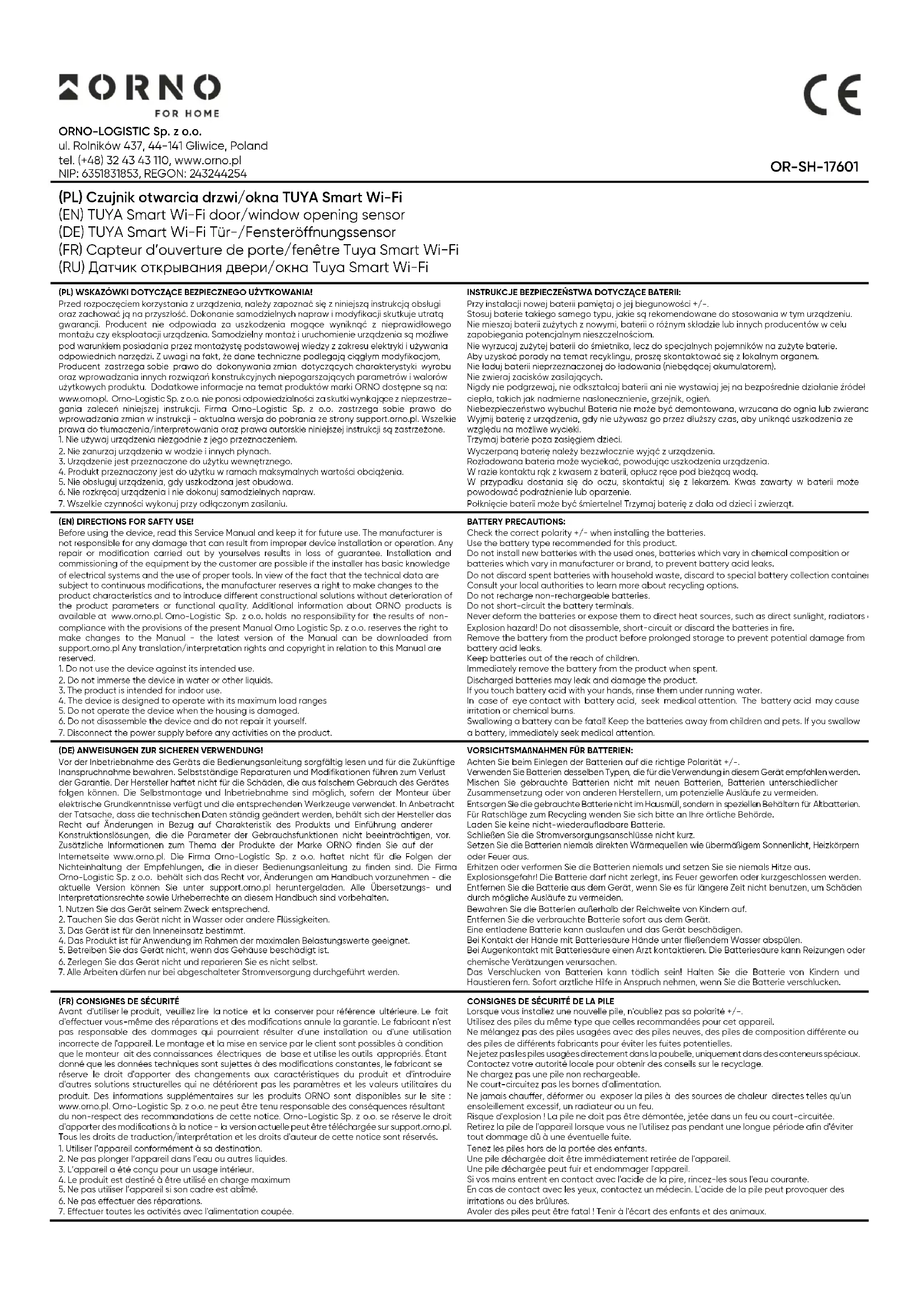 seinen Status und den Batteriestand überprüfen. Wenn Sie den Sensor mit anderen intelligenten Geräten konfigurieren, können Sie alle Geräte in Ihrem Haus effektiv und sicher steuern. Vereinfachte Konformitätserklärung Orno-Logistic Sp. z o.o. erklärt, dass der Funkgerätetyp OR-SH-17601 TUYA Smart Wi-Fi Tür-/Fensteröffnungssensor mit der Richtlinie 2014/53/EU vereinbar ist. Der vollständige Text der EU- Konformitätserklärung ist unter folgender Internetadresse abrufbar: www.orno.pl. (FR) Capteur d’ouverture de porte/fenêtre Tuya Smart Wi-Fi Le capteur d’ouverture de porte et de fenêtre Tuya Smart est un appareil qui complète la maison intelligente. Grâce à l’application avancée Tuya Smart intégrée en Wi-Fi, le capteur permet de surveiller et de contrôler en temps réel l’état d’ouverture des portes ou des fenêtres depuis n’importe quel endroit du monde. Il vous suffit d’installer la plateforme Tuya Smart sur votre téléphone Android ou iOS et de l’appairer avec le capteur. Le contrôle à distance offre non seulement un confort d’utilisation, mais aussi une garantie de sécurité quant à ce qui se passe à l’intérieur de la maison. Le capteur est extrêmement sensible et réagit instantanément à tout mouvement de la porte ou de la fenêtre. L’utilisateur reçoit ainsi une notification instantanée sur son appareil mobile pour l’informer du changement de statut. La possibilité d’intégrer l’application à d’autres appareils donne l’impression d’une maison confortable, intelligente et, surtout, sûre. INSTALLATION