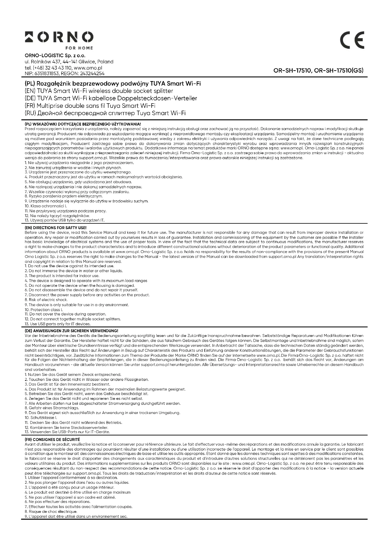 - Konfigurieren Sie die App mit einem Sprachassistenten Ihrer Wahl und steuern Sie Ihre Geräte mit Sprachbefehlen. Vereinfachte Konformitätserklärung Orno-Logistic Sp. z o.o. erklärt, dass der Funkgerätetyp OR-SH-17510 TUYA Smart Wi-Fi kabellose Doppelsteckdosen-Verteiler mit der Richtlinie 2014/53/EU vereinbar ist. Der vollständige Text der EU- Konformitätserklärung ist unter folgender Internetadresse abrufbar: www.orno.pl. (FR) Multiprise double sans fil Tuya Smart Wi-Fi Multiprise double Wi-Fi Tuya Smart représente un dispositif de pointe qui permet de gérer efficacement deux appareils électroniques en même temps à l’aide d'un point de contrôle central. Grâce à la technologie sans fil basée sur une connexion Wi-Fi et la configuration avec l’application Tuya Smart, la multiprise devient extrêmement fonctionnelle mais aussi élégante – éliminant le besoin de câbles traditionnels. Il vous suffit d'installer l'application Tuya Smart sur votre smartphone, qui prend en charge Android et iOS, puis d’affecter la multiprise à votre compte. Le contrôle des appareils connectés devient extrêmement pratique, mais aussi possible de n’importe où dans le monde. Le compteur d’énergie intégré offre un suivi détaillé et une optimisation complète de la consommation d’électricité grâce à l'utilisation de fonctions intelligentes. En outre, la fonction de programmation horaire permet de programmer des heures de fonctionnement spécifiques, ce qui contribue aux économies d’énergie et augmente l’efficacité de l’équipement. Surtout, la possibilité de programmer les heures d’ouverture, de contrôler la synchronisation des appareils et d’effectuer des changements aléatoires pendant les périodes de vacances accroît la sécurité de la maison. La multiprise est dotée de contacts de protection. Le boîtier blanc, fabriqué en plastique de haute qualité, s’intègre parfaitement à une grande variété d’intérieurs, et le montage intuitif vous permet d’utiliser l’appareil presque immédiatement. UTILISATION Pour pouvoir utiliser librement toutes les fonctions la multiprise, celle-ci doit être connectée à un réseau Wi-Fi et à un compte Tuya Smart. Lors de l’appairage, assurez-vous que les fonctions Wi-Fi et Bluetooth sont activées sur le téléphone. 1. Scannez le code QR ou recherchez l’application Tuya Smart dans l’App Store ou Google Play et téléchargez l’application. Après le montage, ouvrez l’application et créez un compte. 2. Connectez la multiprise à la prise. Les boutons de la multiprise doivent clignoter en bleu, ce qui indique que l’appareil est en mode d’appairage. Si les LEDs ne clignotent pas, appuyez sur n’importe quel bouton et maintenez-le enfoncé pendant environ 5 secondes, la LED doit clignoter lorsque vous le relâchez.