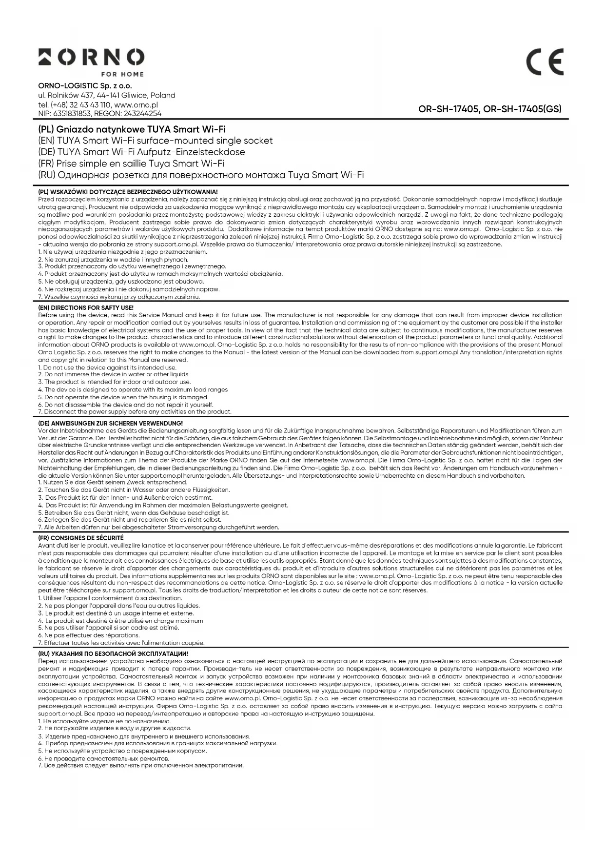 - Konfigurieren Sie die App mit dem Sprachassistenten Ihrer Wahl und steuern Sie Ihre Geräte mit Sprachbefehlen. Vereinfachte Konformitätserklärung Orno-Logistic Sp. z o.o. erklärt, dass der Funkgerätetyp OR-SH-17405 TUYA Smart WiFi Aufputz-Einzelsteckdose mit der Richtlinie 2014/53/EU vereinbar ist. Der vollständige Text der EU-Konformitätserklärung ist unter folgender Internetadresse abrufbar: www.orno.pl. (FR) Prise simple en saillie Tuya Smart Wi-Fi La prise simple en saillie intelligente représente une solution innovante qui vous permettra de contrôler localement et à distance les appareils connectés de la maison. En s’intégrant à la plateforme TUYA Smart, l’utilisateur a la possibilité de contrôler le système à distance, où qu’il se trouve dans le monde. Tout ce qu’il faut faire, c’est installer l’application sur un smartphone compatible avec Android ou iOS. Le contrôle peut donc s’effectuer à la fois à distance via une connexion Wi-Fi et une application, et localement, ce qui vous donnera le contrôle des appareils électriques connectés à la prise. L’indicateur d’énergie intégré vous permet de surveiller et d’optimiser votre consommation d’électricité grâce à la fonction smart. La prise est conçue pour un montage en saillie. Elle dispose d’un contact de protection. Fabriquée en plastique de haute qualité en gris. La finition mate s’intègre parfaitement dans de nombreux intérieurs. Le degré de protection élevé IP55 permet de la monter à l’intérieur dans des zones sèches telles que le salon, le couloir ou la chambre à coucher, ainsi que dans des zones humides telles que la salle de bains ou la cuisine. INSTALLATION