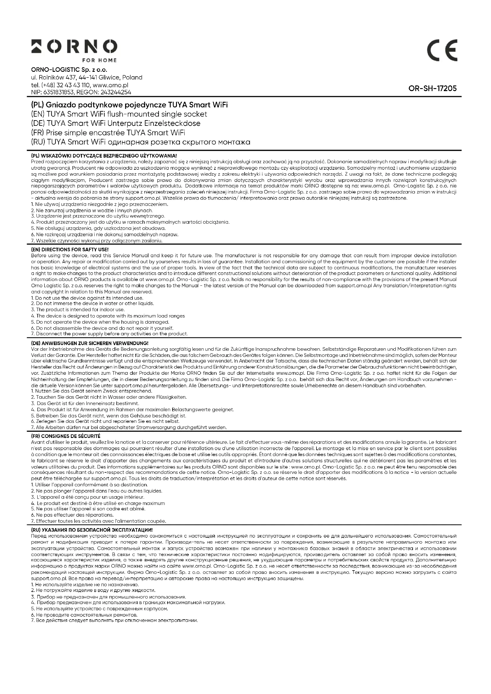 - Konfigurieren Sie die App mit dem Sprachassistenten Ihrer Wahl und steuern Sie Ihre Geräte mit Sprachbefehlen. Vereinfachte Konformitätserklärung Orno-Logistic Sp. z o.o. erklärt, dass der Funkgerätetyp OR-SH-17205 TUYA Smart WiFi Unterputz Einzelsteckdose mit der Richtlinie 2014/53/EU vereinbar ist. Der vollständige Text der EU- Konformitätserklärung ist unter folgender Internetadresse abrufbar: www.orno.pl. (FR) Prise simple encastrée TUYA Smart WiFi La prise simple encastrée intelligente représente une solution innovante qui vous permettra de contrôler localement et à distance les appareils connectés de la maison. En s’intégrant à la plateforme TUYA Smart, l’utilisateur a la possibilité de contrôler le système à distance, où qu’il se trouve dans le monde. Tout ce qu’il faut faire, c’est installer l’application sur un smartphone compatible avec Android ou iOS. Le contrôle peut donc s’effectuer à la fois à distance via une connexion Wi-Fi et une application, et localement, ce qui vous donnera le contrôle des appareils électriques connectés à la prise. L’indicateur d’énergie intégré vous permet de surveiller et d’optimiser votre consommation d’électricité grâce à la fonction smart. La prise est conçue pour un montage encastré. Elle dispose d’un contact de protection. En verre noir ou blanc brillant, elle apporte une touche de modernité à l’intérieur. Le degré de protection IP20 facilite le montage en intérieur dans des zones sèches telles que le salon, le couloir ou la chambre à coucher. Dimensions 86x86 mm. INSTALLATION