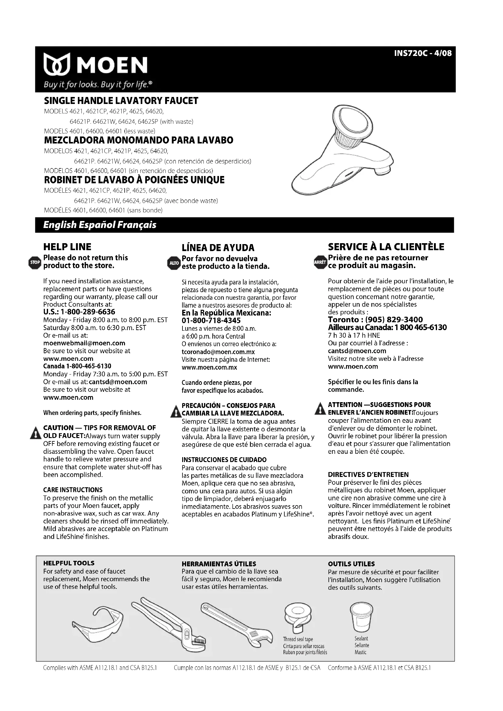 Pour préserver le fini des pièces métalliques du robinet Moen, appliquer une cire non abrasive comme une cire à voiture. Rincer immédiatement le robinet après l’avoir nettoyé avec un agent nettoyant. Les finis Platinum et LifeShine peuvent être nettoyés à l’aide de produits abrasifs doux. Printed in U.S.A. ©2008 Moen Incorporated • 25300 Al Moen Drive • North Olmsted, OH 44070-8022 U.S.A. In Canada Moen Inc. • 2816 Bristol Circle • Oakville, Ontario L6H5S7 Moen Inc. 2816 Bristol Circle Oakville, Ontario L6H 5S7 Moen Incorporated 25300 Al Moen Drive North Olmsted, Ohio 44070-8022 U.S.A. Moen de Mexico, S.A. de C.V. Carretera Saltillo-Monterrey KM 14.7 Ramos Arizpe, Coahuila Mexico 25900 STOP ARRÉT ALTO