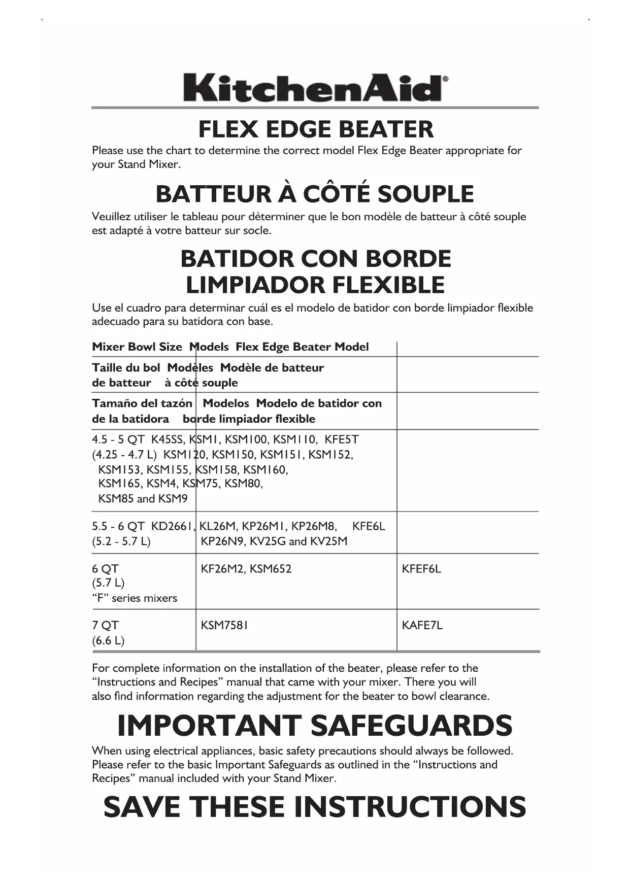 Mixer Bowl Size Models Flex Edge Beater Model Taille du bol Modèles Modèle de batteur de batteur à côté souple Tamaño del tazón Modelos Modelo de batidor con de la batidora borde limpiador exible