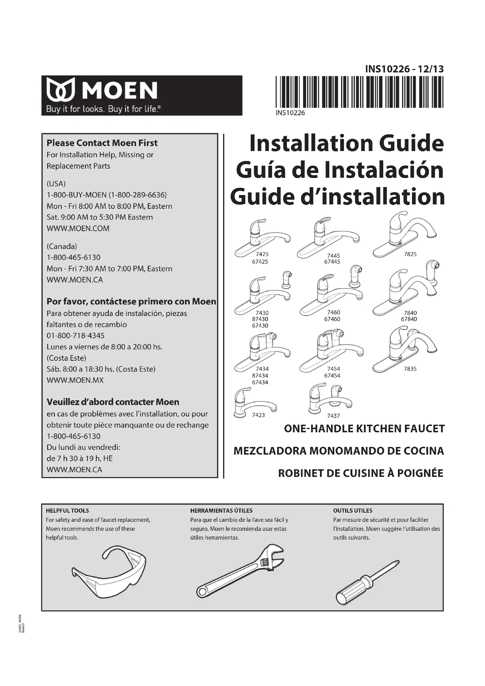 Veuillez d’abord contacter Moen en cas de problèmes avec l’installation, ou pour obtenir toute pièce manquante ou de rechange 1-800-465-6130 Du lundi au vendredi: de 7 h 30 à 19 h, HE