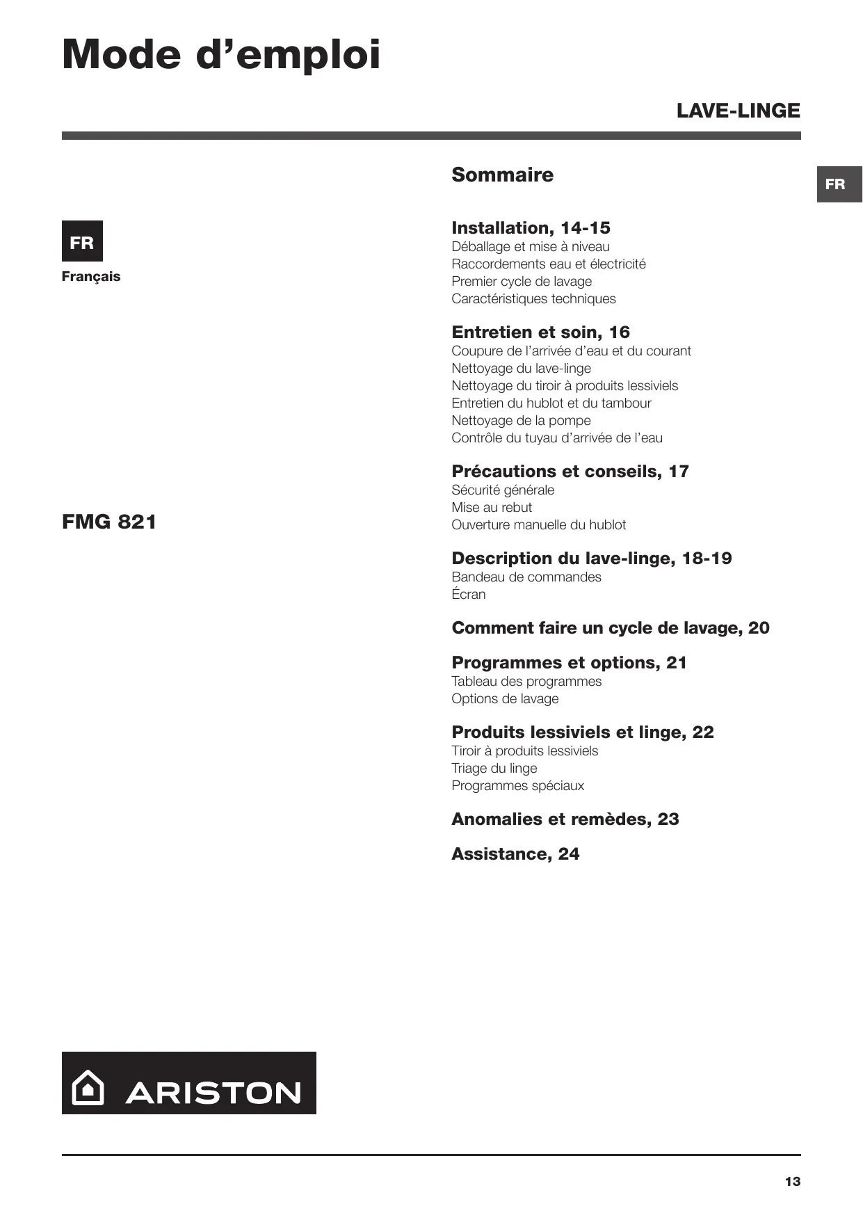 Retrouvez gratuitement la notice de l'appareil FMG 821S MA HOTPOINT au format PDF.