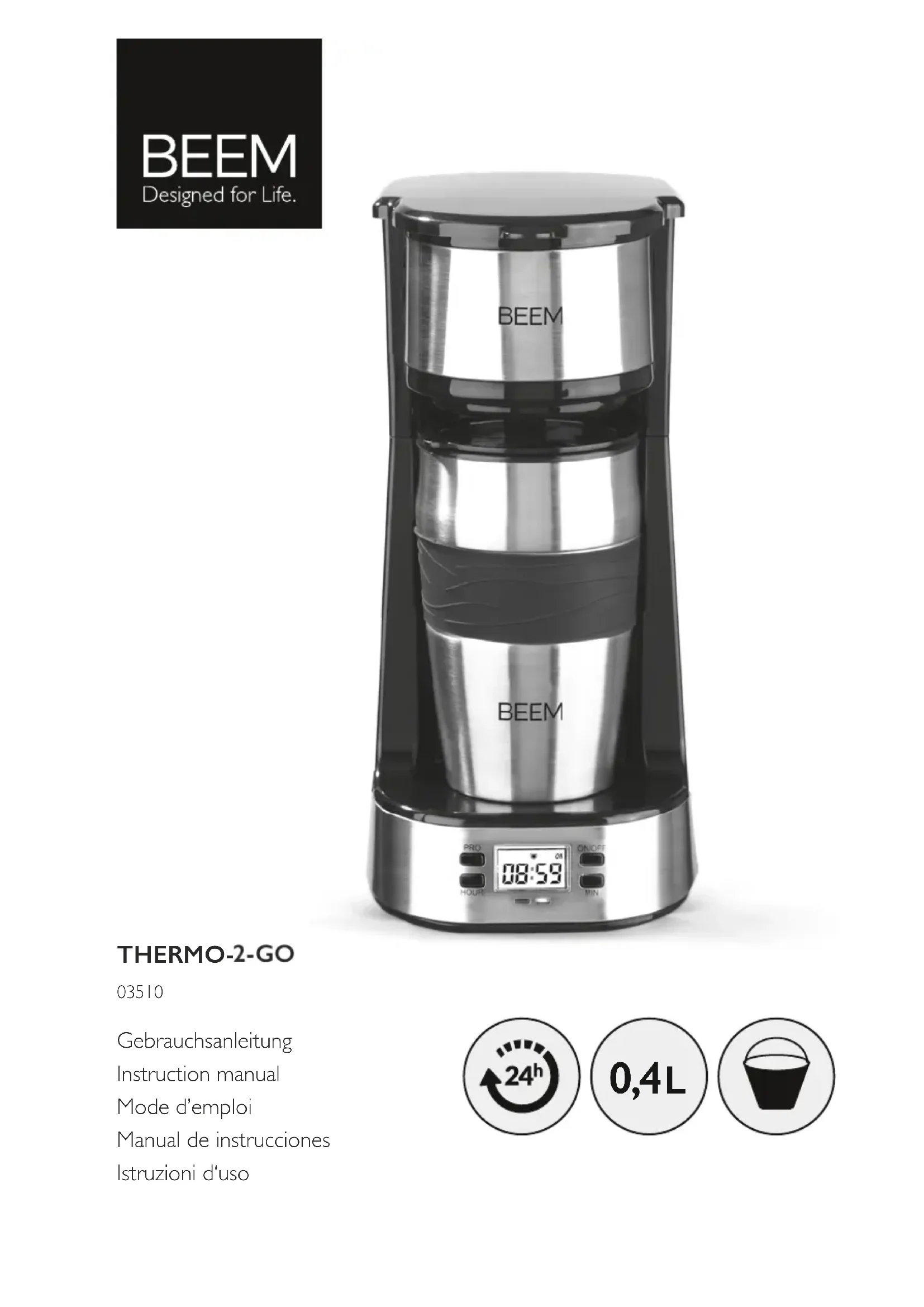 - Mode d‘emploi Assurez-vous que l‘ensemble livré est complet et que les composants ne présentent pas de dommages imputables au transport. En cas de dommages, n’utilisez pas l’appareil et contactez le service après-vente. Ôtez tous les emballages et les éventuels lms protecteurs et protections de transport. N’ôtez jamais la plaque signalétique ni les éventuelles mises en garde apposées. Vue générale de l‘appareil Légende (Illustrations sur le rabat) 1 Couvercle 2 Compartiment à ltre 3 Sortie d’écoulement du café 4 L’unite principale 5 Socle de pose 6 Touche ON / OFF (marche/arrêt) 7 Touche MIN (réglage des minutes) 8 Témoin de fonctionnement rouge 9 Témoin de fonctionnement vert 10 Écran 11 Touche HOUR (réglage des heures) 12 Touche PRO (minuterie) 13 Mug à café à emporter 14 Réservoir d‘eau 15 Couvercle du mug à fermeture coulissante 16 Filtre permanent 17 Porte-ltreFR 30 Félicitations pour votre choix ! Chère cliente, cher client, Nous vous félicitons d‘avoir fait l‘acquisition de cette machine à café ! Pour toute question concernant cet appareil et ses pièces de rechange et accessoires, veuillez contacter le service après-vente à partir de notre site Internet : www.beem.de Informations sur votre mode d‘emploi Veuillez lire attentivement le mode d‘emploi avant la première utilisation de l’appareil et conservez-le précieusement pour toute consultation ultérieure. Si vous donnez ou prêtez cet appareil à une tierce personne, n’oubliez pas d’y joindre ce mode d’emploi. Le fabricant et l‘importateur déclinent toute responsabilité en cas de non-observation des instructions consig- nées dans le mode d’emploi. Explication des symboles Mentions de danger : ces symboles signalent des risques de blessure. Lisez et observez attentivement les consignes de sécurité correspondantes, an de prévenir tout risque de blessure. Informations complémentaires Pour usage alimentaire. Attention aux surfaces chaudes ! Consultez le mode d'emploi avant l'utilisation ! Explication des mentions d’avertissement Les mentions d’avertissement désignent les risques qu’implique le non respect des consignes correspondantes. DANGER – Risque accru induisant des blessures graves, voire mortelles AVERTISSEMENT – Risque moyen pouvant induire des blessures graves, voire mortelles ATTENTION – Risque faible pouvant induire des blessures bénignes ou de moyenne gravité AVIS – Risque de dégâts matériels Utilisation conforme