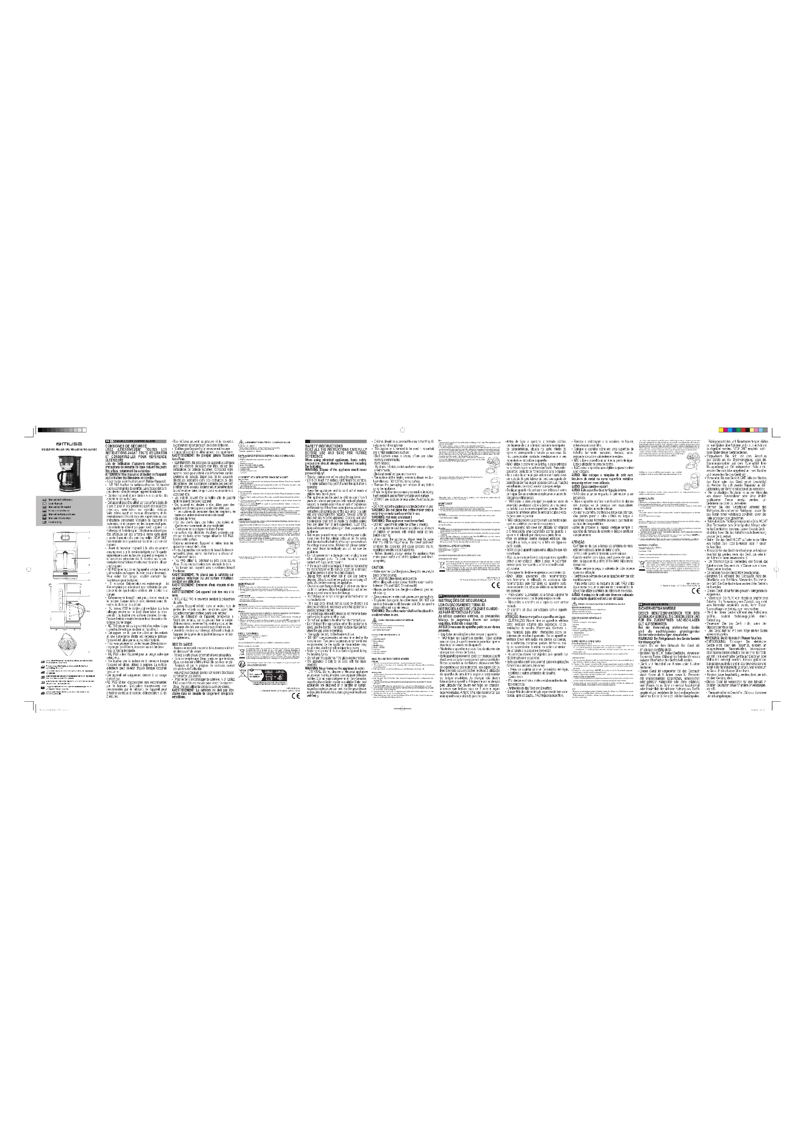 - A cafeteira dispõe de uma proteção contra sobreaquecimento, que desliga automaticamente a cafeteira se esta ameaçar sobreaquecer.Traitement des brûlures:- Faites couler immédiatement de l'eau froide sur la zone touchée.- Ne vous arrêtez pas même pour enlever des vêtements.- Consultez rapidement un médecin.Treating scalds:- Run cold water over the affected area immediately.- Do not stop to remove clothing.- Seek medical advice quickly.Tratamento de queimaduras:- Passe imediatamente água fria sobre a área afetada.- Não pare para retirar a roupa.- Procure aconselhamento médico rapidamente.Ce marquage indique que ce produit ne doit pas être jeté avec les autres déchets ménagers sur tout le territoire de l’UE. Pour éviter d’éventuels dommages à l’environnement ou à la santé humaine dus à une élimination incontrôlée des déchets, recyclez-les de manière responsable an de promouvoir la réutilisation durable des ressources matérielles. Pour retourner votre appareil usagé, veuillez utiliser les systèmes de retour et de collecte ou contacter le revendeur où le produit a été acheté. Ils peuvent reprendre ce produit pour un recyclage sans danger pour l’environnement.This marking indicates that this product should not be disposed with other household wastes throughout the EU. To prevent possible harm to the environment or human health from uncontrolled waste disposal, recycle it responsibly to promote the sustainable reuse of material resources. To return your used device, please use the return and collection systems or contact the retailer where the product was purchased. They can take this product for environmental safe recycling.Esta marcação indica que este produto não deve ser eliminado juntamente com outros resíduos domésticos em toda a UE. Para evitar possíveis danos para o ambiente ou para a saúde humana devido à eliminação descontrolada de resíduos, recicle-o de forma responsável para promover a reutilização sustentável dos recursos materiais. Para devolver o seu aparelho usado, utilize os sistemas de devolução e recolha ou contacte o retalhista onde o produto foi comprado. Este pode levar o produto para uma reciclagem ambientalmente segura.Nettoyage1. Retirer la che de la prise et laisser la machine à café et la verseuse refroidir complètement. 2. Essuyez l'exterieur de la machine à café avec un chiffon légèrement humide.3. La verseuse et le porte-ltre peuvent être nettoyés a l'eau chaude pour la vaisselle ou au lave-vaisselle.AVERTISSEMENT:- Pour éviter tout risque d’électrocution, ne laissez jamais l’humidité pénétrer dans la zone de l’interrupteur ou le cordon.- Ne plongez jamais la base dans l’eau !REMARQUE:Ne nettoyez pas la cafetière avec des éponges métalliques, des détergents abrasifs ou des produits qui nécessitent de frotter/récurer, car ceux-ci peuvent endommager la surface de l’appareil.Détartrer1. Pour détartrer, vous pouvez utiliser un détartrant du commerce (respecter les recommandations du fabricant) ou mélanger du vinaigre avec de l'eau avec un rapport 1:1.2. Remplissez le liquide de détartrage dans le réservoir d'eau, Laissez ensuite le liquide agir pendant environ 15 minutes.