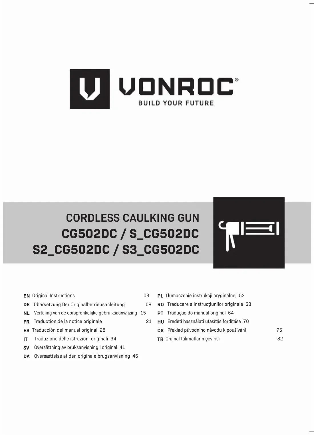 S_ CG502DC CD801AA CD802AA S2_ CG502DC 2 x CD801AA CD802AA S3_ CG502DC CD803AA CD802AA Informations sur la machine Tension 20V Taille de la cartouche 310mlVitesse d'avance 1-4mm/sForce d'extrusion 1,18kNNiveau de pression sonore L 61,8dB(A) Niveau de puissance sonore L 69,8dB(A), K=5dB(A)Vibration a <2,5m/s², K=1,5m/ s²Poids 1,4kg N° de modèle CD801AA Type de batterie Lithium-IonTension 20V Capacité 2.0 AhChargeur recommandé CD802AAPoids 0,3 kg N° de modèle CD802AA Entrée chargeur 220-240V, 50Hz 0,4ASortie chargeur 21V 2,5ADurée de charge batterie 2Ah 60 minutesDurée de charge batterie 4Ah 120 minutesBatteries recommandées CD801AA, CD803AAPoids 0,36 kg N° de modèle CD803AA Type de batterie Lithium-IonTension 20V Capacité 4.0 AhChargeur recommandé CD802AAPoids 0,65 kg N'utilisez que les batteries suivantes de la plate- forme Batterie VONROC VPOWER 20V. L'utilisation de toute autre batterie pourrait provoquer de graves blessures ou endommager l'outil. CD801AA 20V, 2Ah Lithium-Ion CD803AA 20V, 4Ah Lithium-Ion Le chargeur suivant peut être utilisé pour recharger ces batteries. CD802AA Chargeur rapide Les batteries de la plateforme Batterie VONROC VPOWER 20V sont interchangeables pour tous les outils de la plateforme Batterie VONROC VPOWER 20V. PRÉSENTATION Les numéros dans le texte font référence aux diagrammes de la page 2.