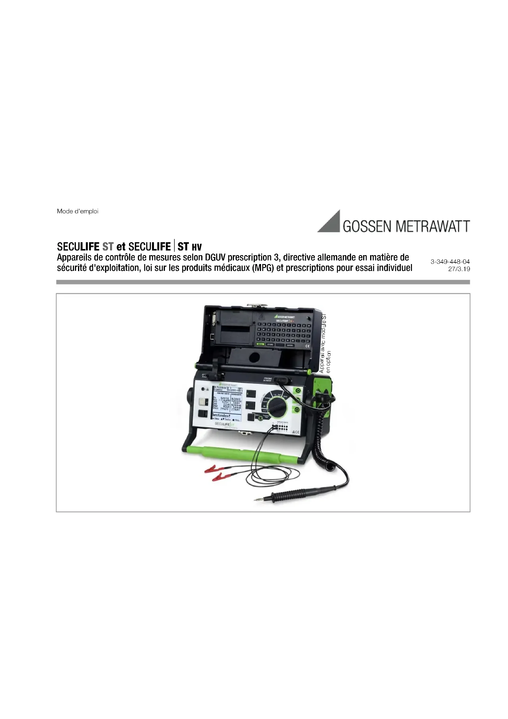 SECULIFE ST et SECULIFE⏐ST HV Appareils de contrôle de mesures selon DGUV prescription 3, directive allemande en matière de sécurité d'exploitation, loi sur les produits médicaux (MPG) et prescriptions pour essai individuel 3-349-448-04 27/3.19 Mode d'emploi