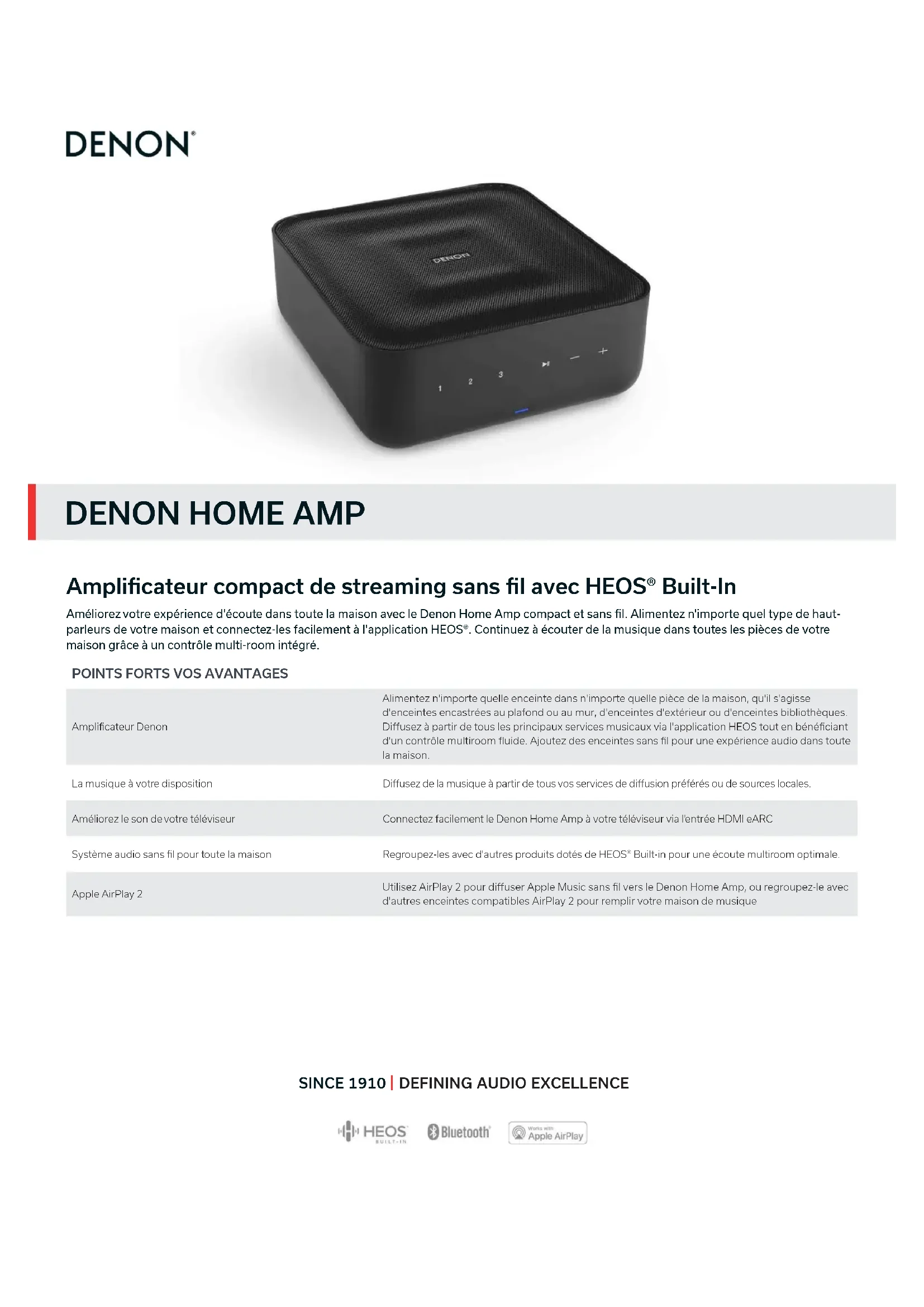 Amplificateur DenonAlimentez n'importe quelle enceinte dans n'importe quelle pièce de la maison, qu'il s'agisse d'enceintes encastrées au plafond ou au mur, d'enceintes d'extérieur ou d'enceintes bibliothèques. Diffusez à partir de tous les principaux services musicaux via l'application HEOS tout en bénéficiant d'un contrôle multiroom fluide. Ajoutez des enceintes sans fil pour une expérience audio dans toute la maison. La musique à votre disposition Diffusez de la musique à partir de tous vos services de diffusion préférés ou de sources locales. Améliorez le son de votre téléviseur Connectez facilement le Denon Home Amp à votre téléviseur via l'entrée HDMI eARC Système audio sans fil pour toute la maison Regroupez-les avec d'autres produits dotés de HEOS® Built-in pour une écoute multiroom optimale. Apple AirPlay 2Utilisez AirPlay 2 pour diffuser Apple Music sans fil vers le Denon Home Amp, ou regroupez-le avec d'autres enceintes compatibles AirPlay 2 pour remplir votre maison de musique Améliorez votre expérience d'écoute dans toute la maison avec le Denon Home Amp compact et sans fil. Alimentez n'importe quel type de haut- parleurs de votre maison et connectez-les facilement à l'application HEOS®. Continuez à écouter de la musique dans toutes les pièces de votre maison grâce à un contrôle multi-room intégré.HEOS® logo is trademark or registered trademark in the US and/or other countries. Availability of music services may vary by region. Not all services may be available at time of purchase. Some services may be added or discontinued from time to time based on decisions by the music service providers or others. Visit www.denon.com for announcements and details. HEOS app and brand is not affiliated with any manufacturer of any smart phone. The Bluetooth