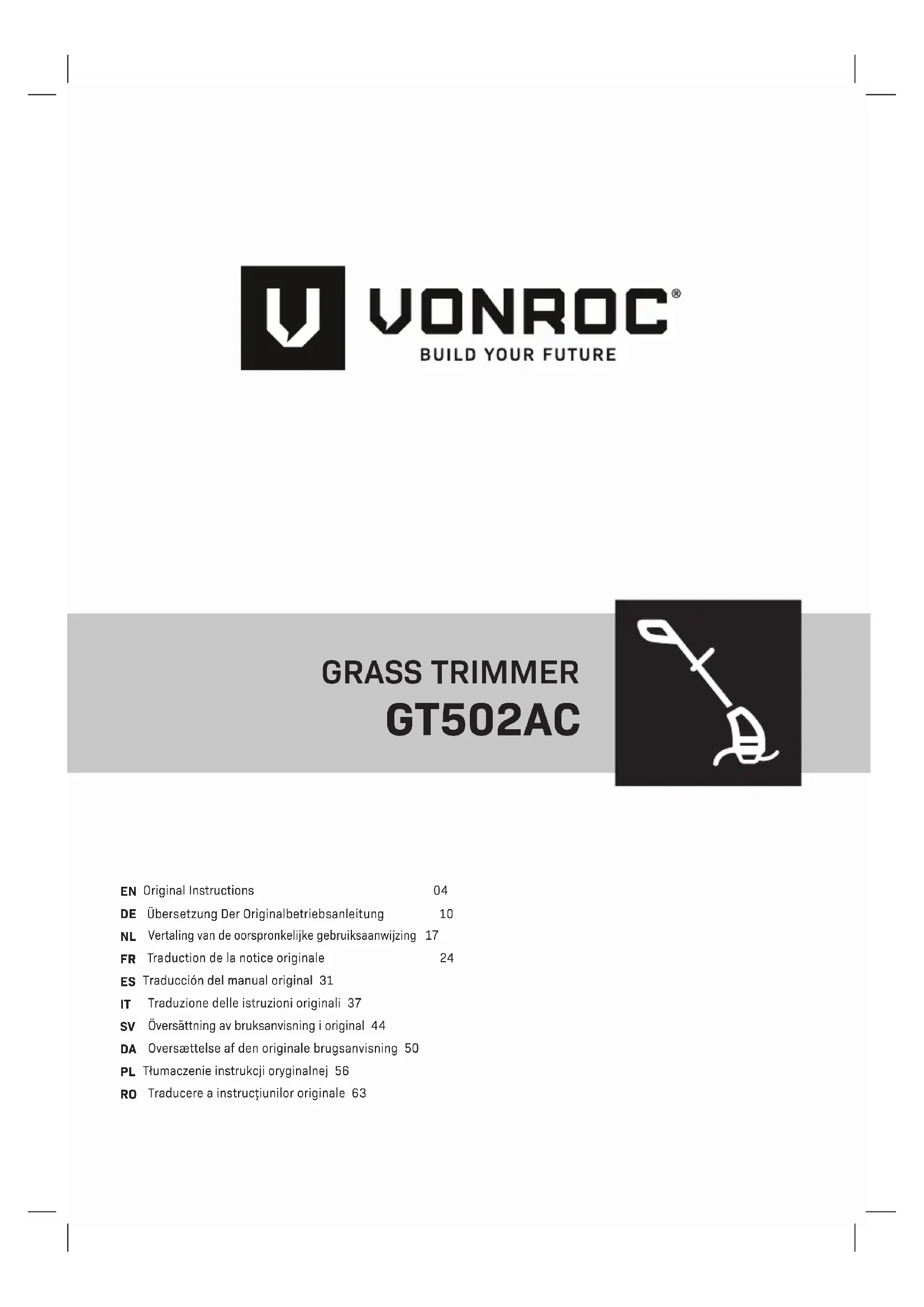 - Ne laissez le coupe-bordure au sol trop long- temps car cela pourrait déformer le carter de protection et engendrer un risque pour la sé- curité. Suspendez le en hauteur par la poignée supérieure Nettoyage Nettoyez régulièrement le boîtier de la machine avec un chiffon doux et de préférence après cha- que utilisation. Gardez les fentes d'aération exemp- tes de poussière et de saleté. Si la saleté ne part pas, utilisez un chiffon doux humidifié avec de l’eau savonneuse. N'utilisez jamais de solvants comme l'essence, l'alcool, l'ammoniaque, etc. Ces solvants peuvent endommager les pièces en plastique. ENVIRONNEMENT Les équipements électroniques ou électriques défectueux ou destinés à être mis au rebut doivent être déposés aux points de recyclage appropriés. Uniquement pour les pays de l’UE Ne jetez pas les outils électriques avec les déchets domestiques. Selon la Directive européenne 2012/19/CE relative aux déchets d’équipements électriques et électroniques et sa mise en oeuvre dans le droit national, les outils électriques hors d’usage doivent être collectés séparément et mis au rebut de manière écologique. GARANTIE Les produits VONROC sont développés aux plus hauts standards de qualité et ils sont garantis contre les défauts de pièces et de main d’oeuvre pendant la durée légale stipulée à partir de la date d’achat d’origine du produit. En cas d’une quelconque panne du produit pendant cette durée qui serait due à un défaut matériel et/ou de main d’oeuvre, contactez directement VONROC. Les circonstances suivantes ne sont pas prises en charge par la garantie: