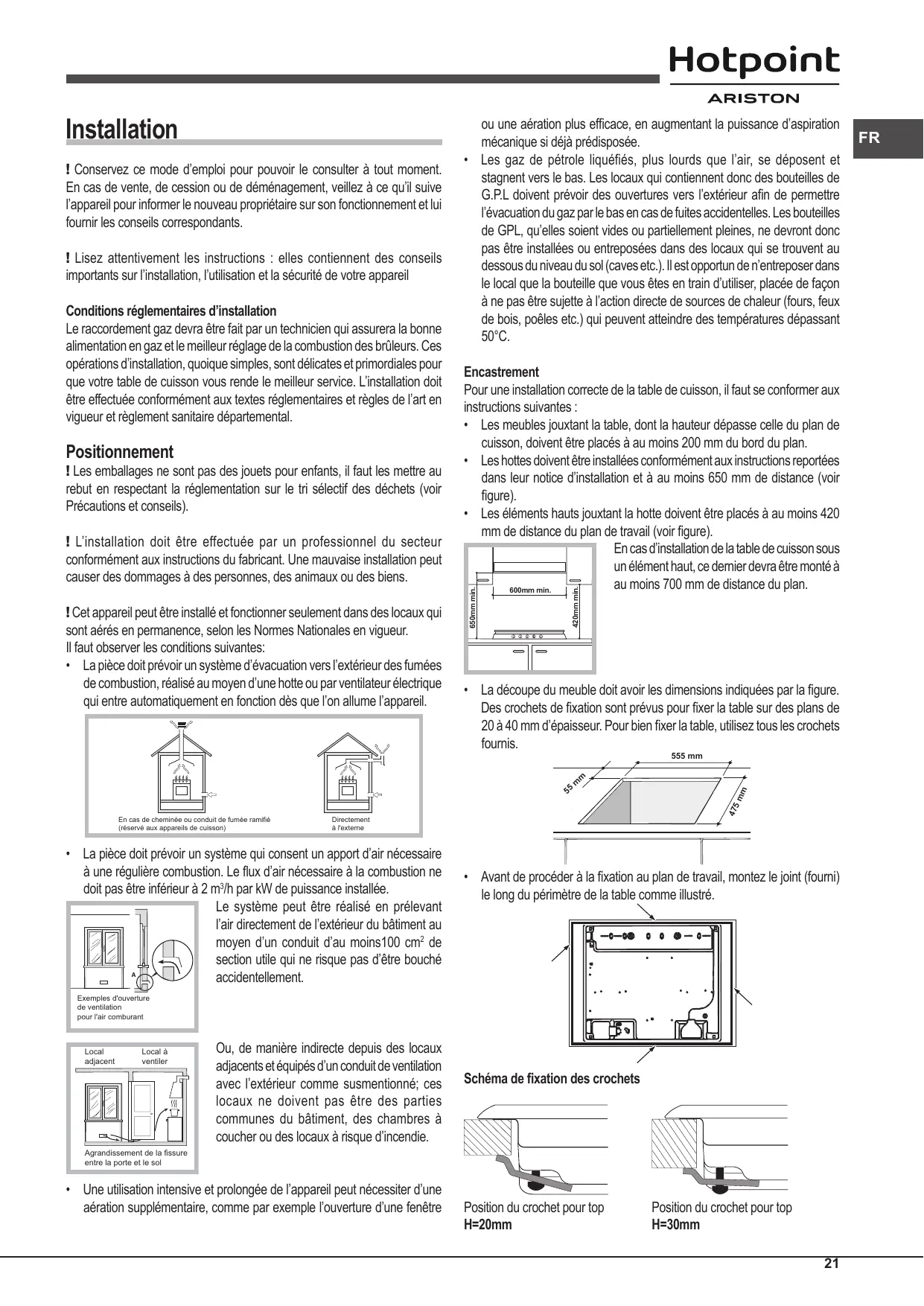 ! Utilisez tous les crochets compris dans le “sachet accessoires” • Si la table n’est pas installée au-dessus d’un four à encastrer, il faut monter un panneau d’isolation en bois. Il faut le monter à au moins 20 mm de distance du bord inférieur de la table. Aération Pour garantir une bonne aération, la cavité d’encastrement doit être dépourvue de paroi arrière. Il est conseillé d’installer le four de manière à ce qu’il repose sur deux cales en bois ou bien sur un plan d’appui continu qui ait une découpe d’au moins 45 x 560 mm (voir figures).