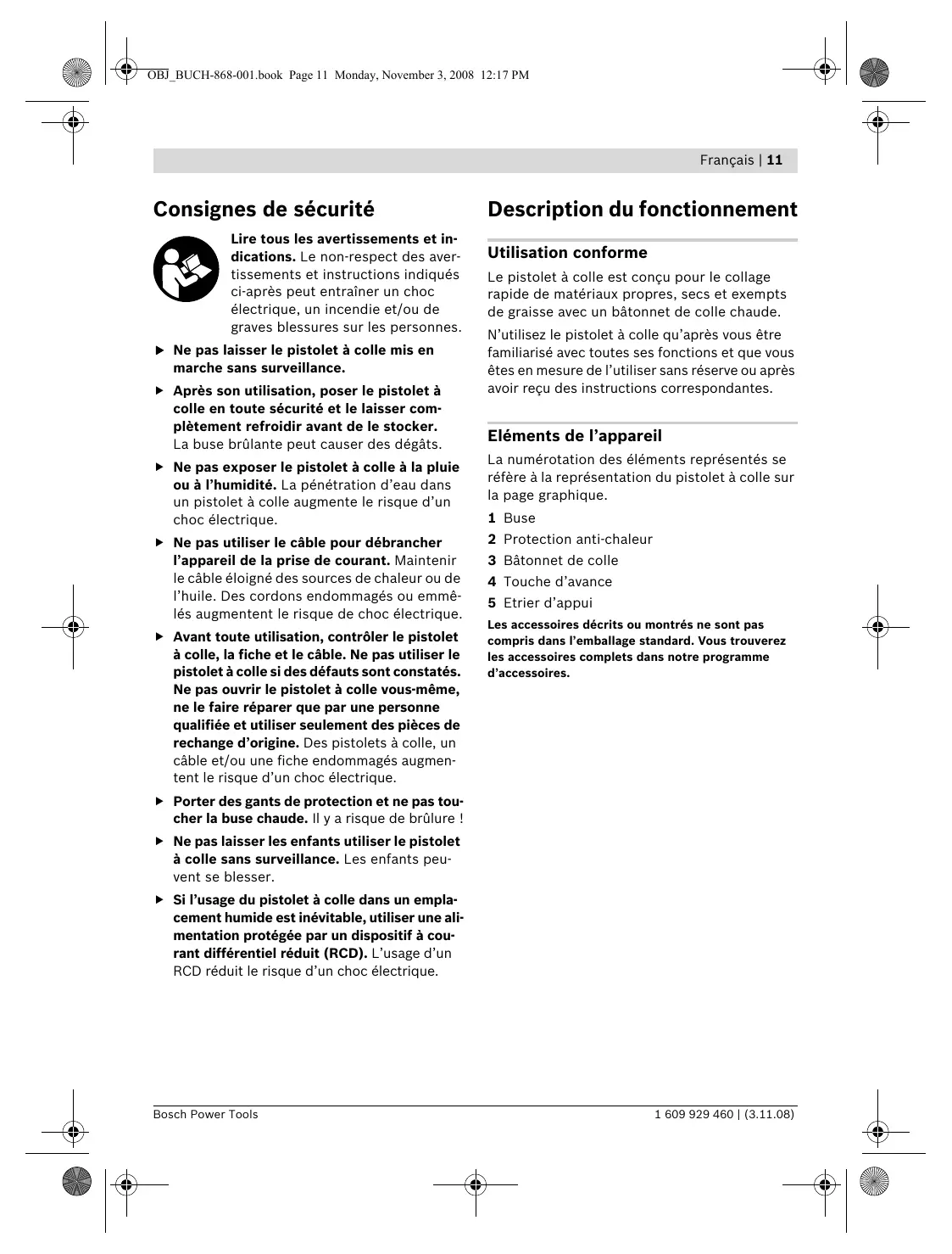 La numérotation des éléments représentés se réfère à la représentation du pistolet à colle sur la page graphique. 1 Buse 2 Protection anti-chaleur 3 Bâtonnet de colle 4 Touche d’avance à colle sans surveillance. Les enfants peuvent se blesser. f Si l’usage du pistolet à colle dans un emplacement humide est inévitable, utiliser une alimentation protégée par un dispositif à courant différentiel réduit (RCD). L’usage d’un RCD réduit le risque d’un choc électrique.