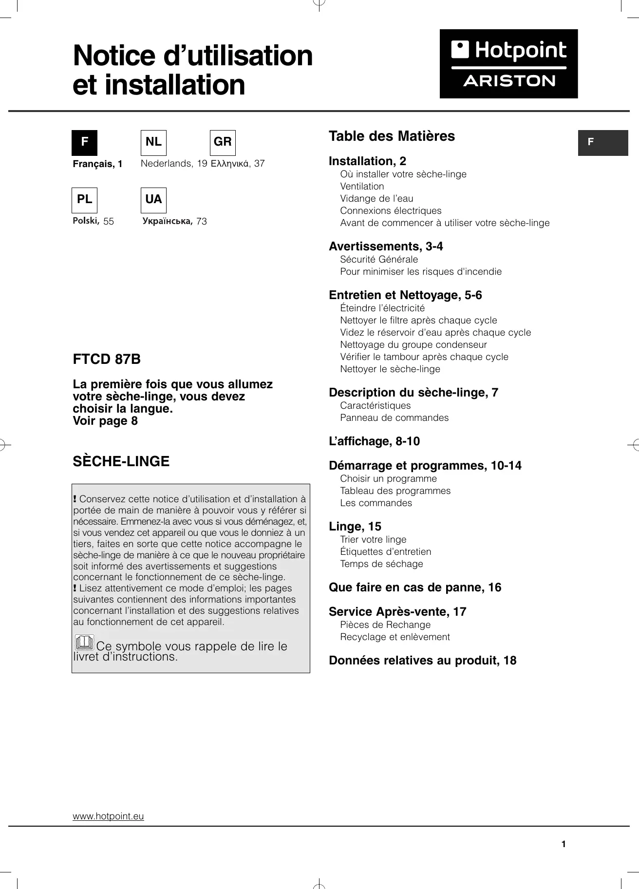 Installation, 2 Où installer votre sèche-linge Ventilation Vidange de l’eau Connexions électriques Avant de commencer à utiliser votre sèche-linge Avertissements, 3-4 Sécurité Générale Pour minimiser les risques d'incendie Entretien et Nettoyage, 5-6 FTCD 87B La première fois que vous allumez votre sèche-linge, vous devez choisir la langue. Voir page 8 Éteindre l’électricité Nettoyer le filtre après chaque cycle Videz le réservoir d’eau après chaque cycle Nettoyage du groupe condenseur Vérifier le tambour après chaque cycle Nettoyer le sèche-linge Description du sèche-linge, 7 Caractéristiques Panneau de commandes L’affichage, 8-10 SÈCHE-LINGE ! Conservez cette notice d’utilisation et d’installation à portée de main de manière à pouvoir vous y référer si nécessaire. Emmenez-la avec vous si vous déménagez, et, si vous vendez cet appareil ou que vous le donniez à un tiers, faites en sorte que cette notice accompagne le sèche-linge de manière à ce que le nouveau propriétaire soit informé des avertissements et suggestions concernant le fonctionnement de ce sèche-linge. ! Lisez attentivement ce mode d’emploi; les pages suivantes contiennent des informations importantes concernant l’installation et des suggestions relatives au fonctionnement de cet appareil. Ce symbole vous rappele de lire le livret d’instructions. Démarrage et programmes, 10-14 Choisir un programme Tableau des programmes Les commandes Linge, 15 Trier votre linge Étiquettes d’entretien Temps de séchage Que faire en cas de panne, 16 Service Après-vente, 17 Pièces de Rechange Recyclage et enlèvement Données relatives au produit, 18 www.hotpoint.eu