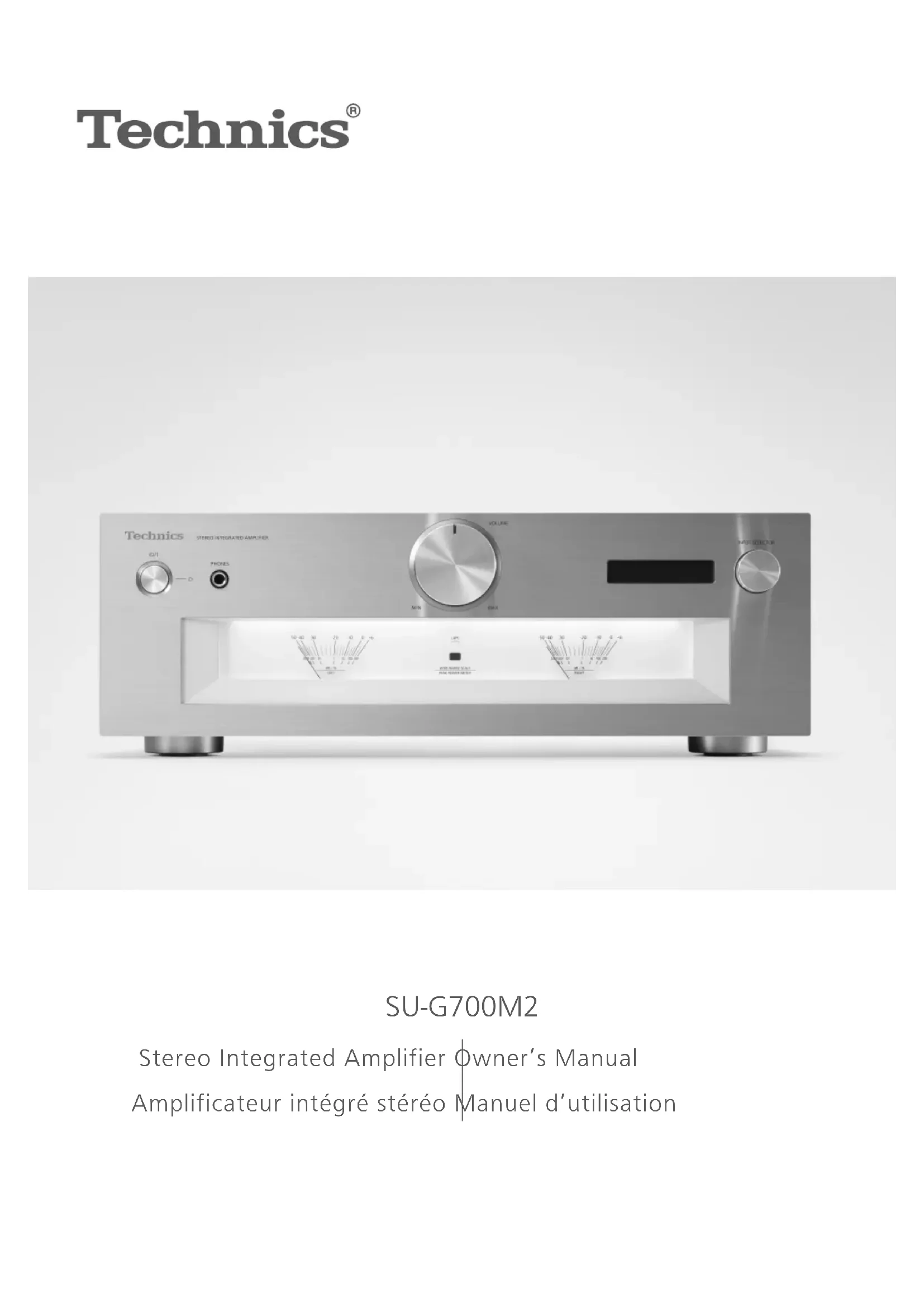 SU-G700M2 Stereo Integrated Amplifier Owner’s Manual Amplificateur intégré stéréo Manuel d’utilisation02 (02) Music is borderless and timeless, touching people’s hearts across cultures and generations. Each day the discovery of a truly emotive experience from an unencountered sound awaits. Let us take you on your journey to rediscover music. Sans frontières, la musique est aussi intemporelle, touchant le coeur des gens en traversant les cultures et les générations. Tous les jours, nous attendons la révélation d’une expérience émotionnelle authentique à partir d’un son venu de nulle part. Permettez-nous de vous emmener en voyage pour redécouvrir la musique.03 (03) Delivering the Ultimate Emotive Musical Experience to All At Technics we understand that the listening experience is not purely about technology but the magical and emotional relationship between people and music. We want people to experience music as it was originally intended and enable them to feel the emotional impact that enthuses and delights them. Through delivering this experience we want to support the development and enjoyment of the world’s many musical cultures. This is our philosophy. With a combination of our love of music and the vast high-end audio experience of the Technics team, we stand committed to building a brand that provides the ultimate emotive musical experience by music lovers, for music lovers. Apportez à tous l’expérience musicale empreinte d’émotions Chez Technics, nous savons que l’expérience de l’écoute n’est pas purement et simplement une question de technologie, mais de relation magique entre les personnes et la musique. Nous voulons que tout un chacun puisse ressentir la musique telle qu’elle a été conçue à l’origine et lui permettre de ressentir le choc émotionnel qu’il brûle de connaître. En apportant ce vécu, nous cherchons à accompagner le développement et le plaisir des nombreuses cultures musicales du monde. Telle est notre philosophie. Ici et maintenant, alliant l’amour de la musique et la grande expérience musicale de l’équipe Technics, nous sommes pleinement déterminés à construire une marque qui apporte le vécu musical émotionnel aux fervents de la musique. Director Directeur Michiko Ogawa04 Thank you for purchasing this product. Please read these instructions carefully before using this product, and save this manual for future use.