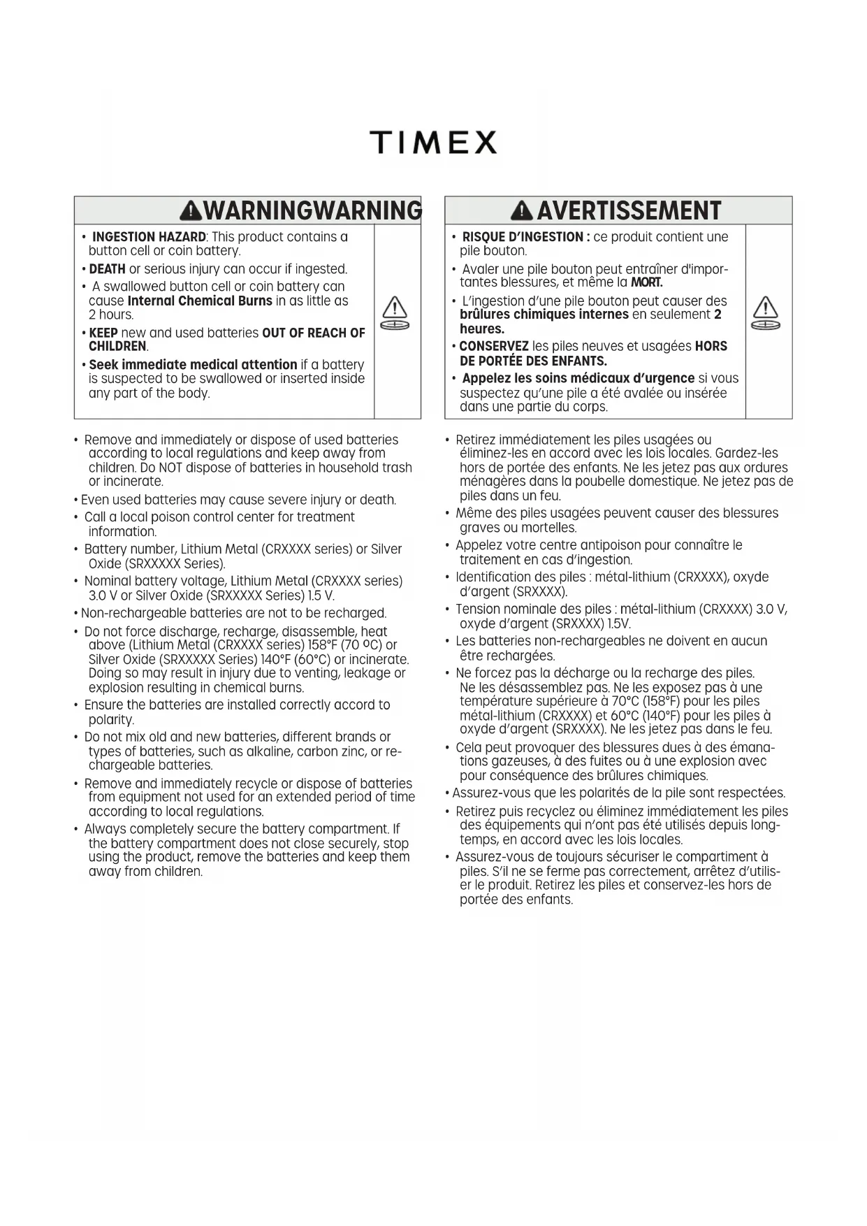 PILE Timex recommande fortement de faire changer la pile par un détaillant ou un bijoutier. Le cas échéant, appuyer sur le bouton de remise à zéro lors du changement de la pile. Le type de pile est indiqué sur le dos du boîtier. L’estimation de la durée de service de la pile est basée sur certaines hypothèses quant à l’usage ; la durée réelle peut varier selon l’utilisation de la montre. NE PAS JETER LA PILE AU FEU. NE PAS RECHARGER LA PILE. GARDER LES PILES HORS DE LA PORTÉE DES ENFANTS.