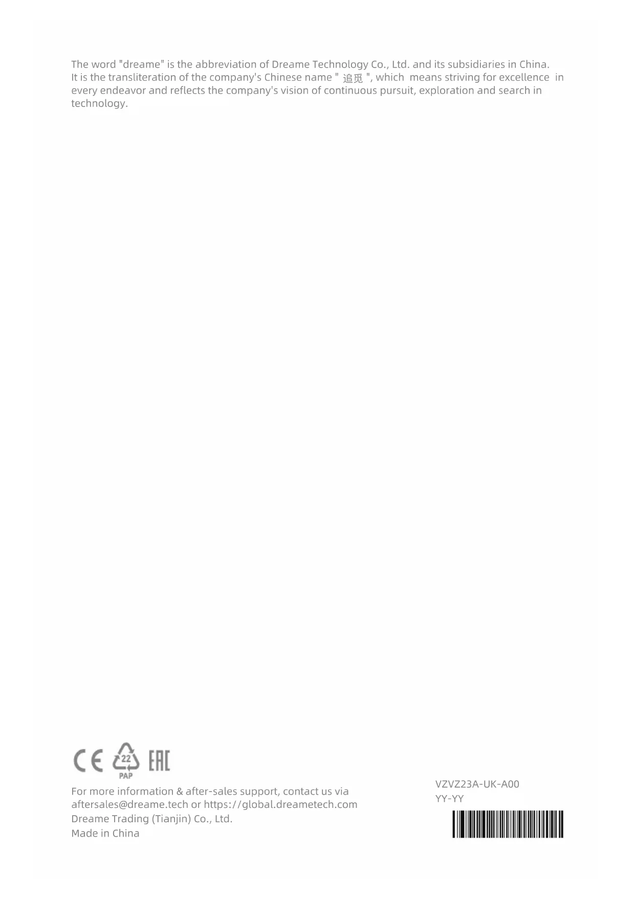Nous, Dreame Trading (Tianjin) Co., Ltd., déclarons par la présente que cet équipement est conforme aux directives, normes européennes et amendements applicables. L'intégralité du texte de la déclaration UE de conformité est disponible à l'adresse Internet suivante : https://global.dreametech.com Pour consulter le mode d'emploi en ligne, veuillez accéder à https://global.dreametech. com/pages/user-manuals-and-faqs