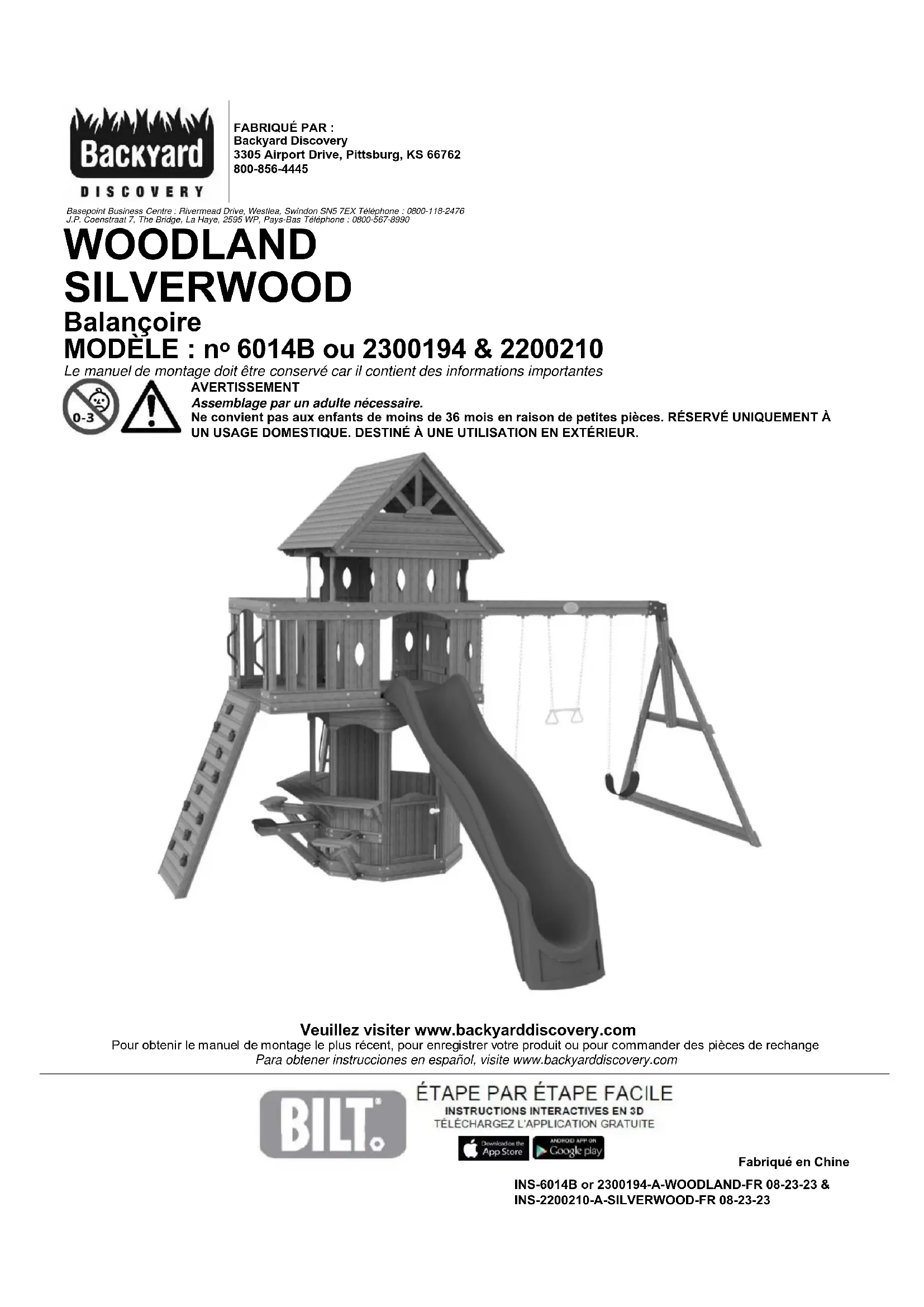 FABRIQUÉ PAR : Backyard Discovery 3305 Airport Drive, Pittsburg, KS 66762 800-856-4445 AVERTISSEMENT Assemblage par un adulte nécessaire. Ne convient pas aux enfants de moins de 36 mois en raison de petites pièces. RÉSERVÉ UNIQUEMENT À UN USAGE DOMESTIQUE. DESTINÉ À UNE UTILISATION EN EXTÉRIEUR. Veuillez visiter www.backyarddiscovery.com Pour obtenir le manuel de montage le plus récent, pour enregistrer votre produit ou pour commander des pièces de rechange Para obtener instrucciones en español, visite www.backyarddiscovery.com Fabriqué en Chine INS-6014B or 2300194-A-WOODLAND-FR 08-23-23 & INS-2200210-A-SILVERWOOD-FR 08-23-23 Basepoint Business Centre : Rivermead Drive, Westlea, Swindon SN5 7EX Téléphone : 0800-118-2476 J.P. Coenstraat 7, The Bridge, La Haye, 2595 WP, Pays-Bas Téléphone : 0800-567-8990 WOODLAND SILVERWOOD Balançoire MODÈLE : n