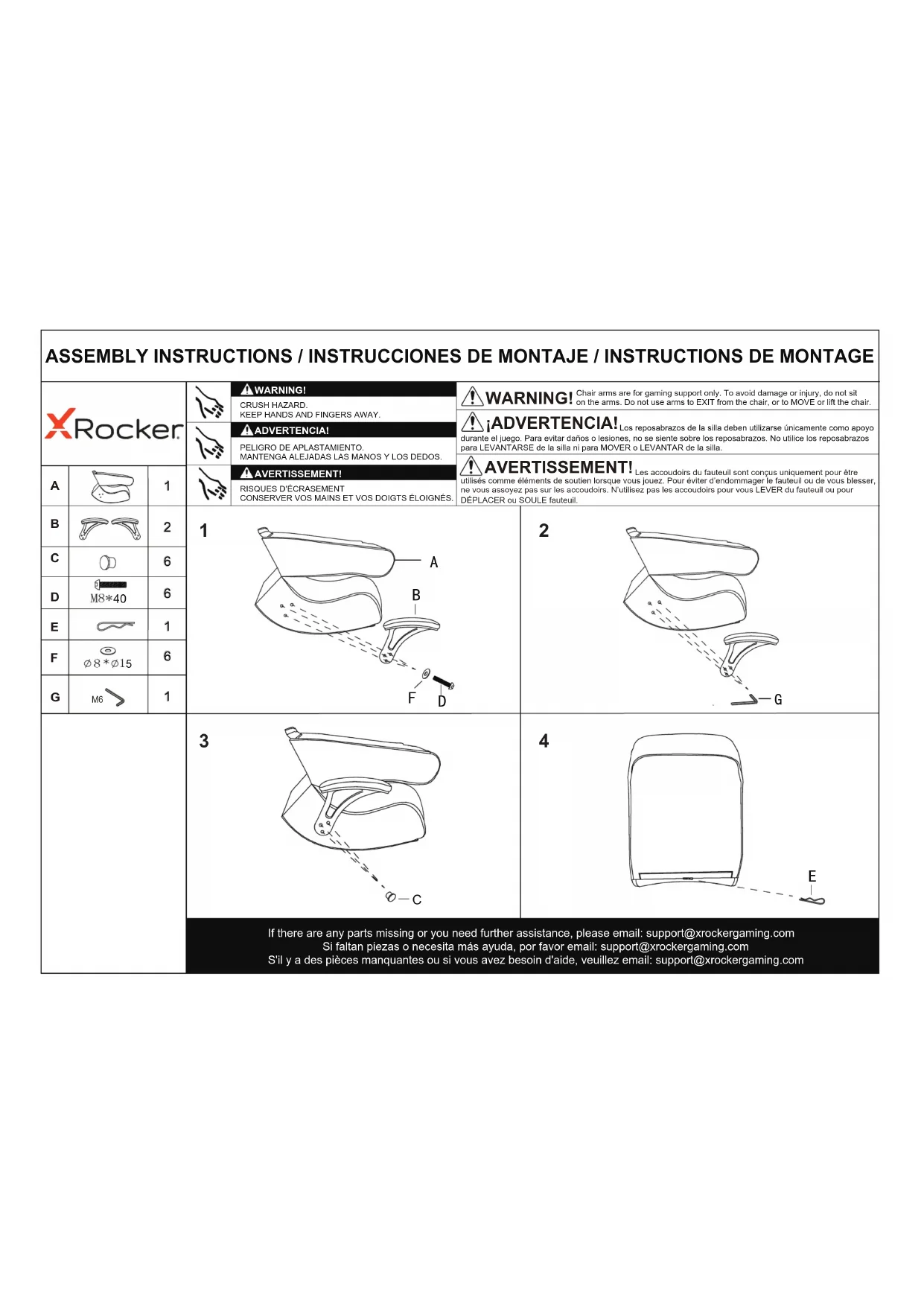 If there are any parts missing or you need further assistance, please email: support@xrockergaming.comSi faltan piezas o necesita más ayuda, por favor email: support@xrockergaming.comS'il y a des pièces manquantes ou si vous avez besoin d'aide, veuillez email: support@xrockergaming.comLes accoudoirs du fauteuil sont conçus uniquement pour être ASSEMBLY INSTRUCTIONS / INSTRUCCIONES DE MONTAJE / INSTRUCTIONS DE MONTAGE