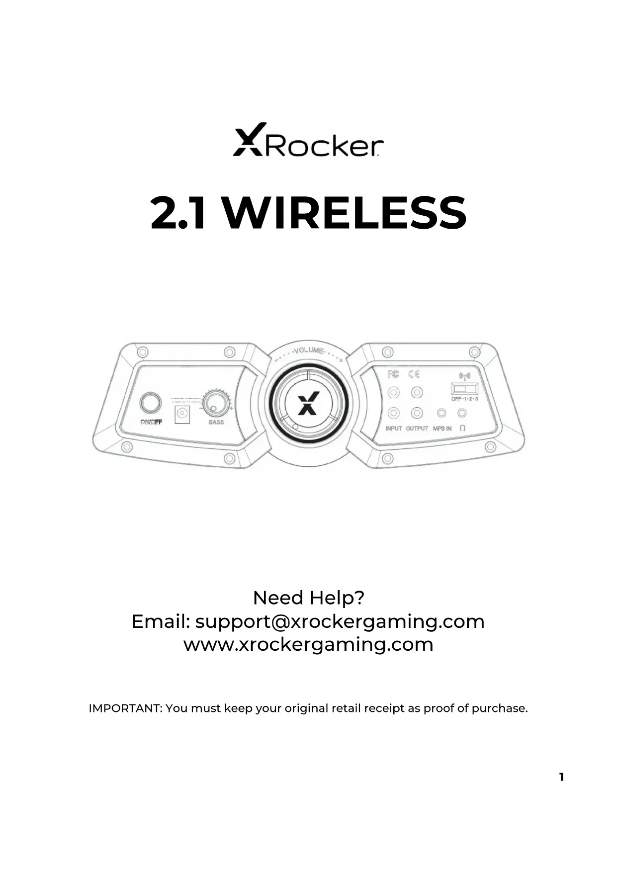 This device complies with Industry Canada licence-exempt RSS standard(s). Operation is subject to the following two conditions: (1) this device may not cause interference, and (2) this device must accept any interference, including interference that may cause undesired operation of the device. Le présent appareil est conforme aux CNR d'Industrie Canada applicables aux appareils radio exempts. L'exploitation est autorisée aux deux conditions suivantes : (1) l'appareil ne doit pas causer d'interférences, et (2) l'utilisateur de l'appareil doit accepter tout brouillage radioélectrique subi, même si le brouillage est susceptible d'en compromettre le fonctionnement. IC Radiation Exposure Statement: This equipment complies with Canada radiation exposure limits set forth for uncontrolled environments. This transmitter must not be co-located or operating in conjunction with any other antenna or transmitter. Déclaration d’IC sur l’exposition aux radiations: Cet équipement est conforme aux limites d’exposition aux radiations définies par le Canada pour des environnements non contrôlés. Cet émetteur ne doit pas être installé au même endroit ni utilisé avec une autre antenne ou un autre émetteur. Need Help? Email: support@xrockergaming.com www.xrockergaming.com IMPORTANT: You must keep your original retail receipt as proof of purchase.