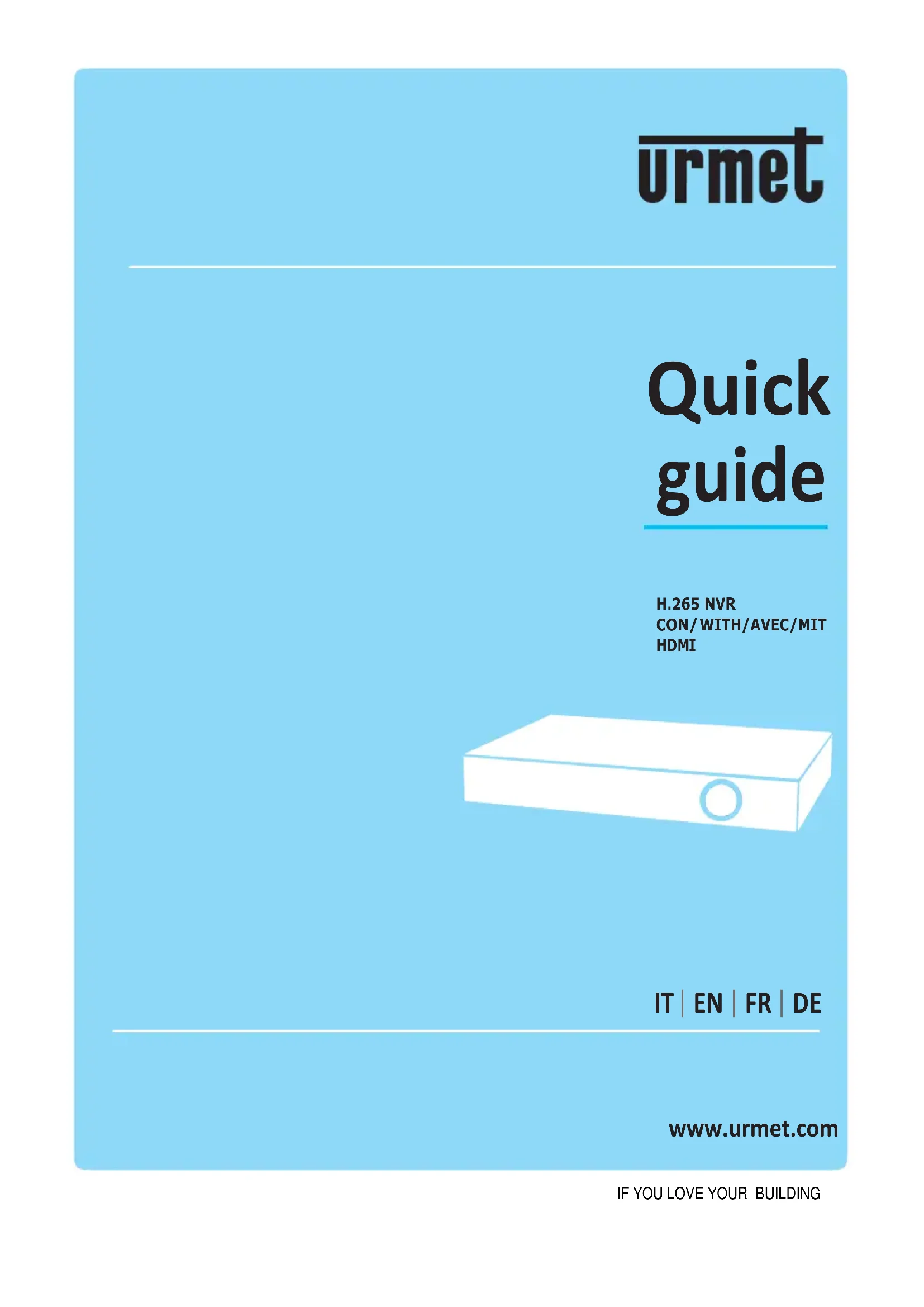 - NOTA BENE Pour plus d’informations, faire référence au manuel des instructions présent sur le site Urmet. Pour télécharger le manuel depuis le site, se reporter au code QR en fin de manuel. AVERTISSEMENTS Alimentation Avant de brancher l’appareil au secteur d’alimentation, s’assurer que les données nominales correspondent à celles du secteur d’alimentation. Ne pas tirer le câble d’alimentation pour débrancher le dispositif. Éteindre le dispositif avant de couper l'alimentation. Cette opération ne doit pas être effectuée alors que le NVR effectue un enregistrement ou une reproduction ni depuis le menu de configuration. Interrompre tout enregistrement et toute reproduction avant de débrancher le dispositif pour prévenir tout risque de dommages causés au disque dur. Recommandations de sécurité Pour prévenir les risques d'incendie et d'électrocution, éviter d’exposer le dispositif à la pluie et à l'humidité ainsi que d’introduire tout objet solide et tout liquide à l'intérieur du dispositif. Si tel devait être le cas, débrancher l’appareil du secteur d’alimentation et le faire contrôler par un personnel qualifié. En aucun cas, le dispositif ne doit être ouvert. Pour toute intervention de réparation, faire appel à un personnel qualifié ou contacter le centre d’assistance technique agréé (www.urmet.com >> Contacts >> Centres d’assistance technique). Conserver le dispositif loin des enfants pour prévenir tout risque de dommage accidentel. Ne pas toucher l’appareil avec les mains mouillées pour éviter les risques de décharge électrique et de dommages mécaniques. En cas de chute de l’appareil ou en cas de dommages de l’enveloppe externe, en interrompre l’utilisation. Ne pas en interrompre l’utilisation dans de telles conditions expose à des risques de décharge électrique. Dans le cas où cela se produirait, contacter le revendeur ou l’installateur agréé. Recommandations d’installation Pour éviter la surchauffe du dispositif, le placer dans une position permettant le passage de l'air à travers les fentes de l'enveloppe extérieure. Veiller à maintenir un espace libre d'au moins 5 cm quand l’appareil est installé dans un rack. Pour la même raison, ne pas installer l’appareil près de sources de chaleur telles que des radiateurs ou des conduits d'air chaud. Ne pas exposer à la lumière directe du soleil. Ne pas installer à un endroit excessivement exposé à la poussière, aux vibrations mécaniques ou aux chocs. Ne pas placer le dispositif sur une surface qui ne garantirait pas la stabilité nécessaire (table instable ou plan incliné par exemple). Sur une telle surface, le dispositif pourrait tomber et causer des blessures ou des dommages mécaniques. Ne pas installer le dispositif à un endroit où il serait exposé à l’humidité ou à l’eau. Éviter les jets d’eau sur le dispositif pour prévenir les risques d’incendie, les décharges électriques et les dommages mécaniques. Dans le cas où de l’eau ou tout autre produit s’infiltrerait dans le dispositif, ne plus l’utiliser pour prévenir les risques d’incendie et de décharges électriques. Dans le cas où cela se produirait, contacter le revendeur ou l’installateur agréé. Ne pas poser d’objets lourds ni d’appareils produisant de la chaleur sur le dispositif : cela pourrait endommager l’enveloppe extérieure et/ou augmenter la température interne et causer des dommages. Ne pas couvrir l’appareil d’un chiffon alors qu’il est en marche pour prévenir les déformations de l’enveloppeDS1098-031E 41