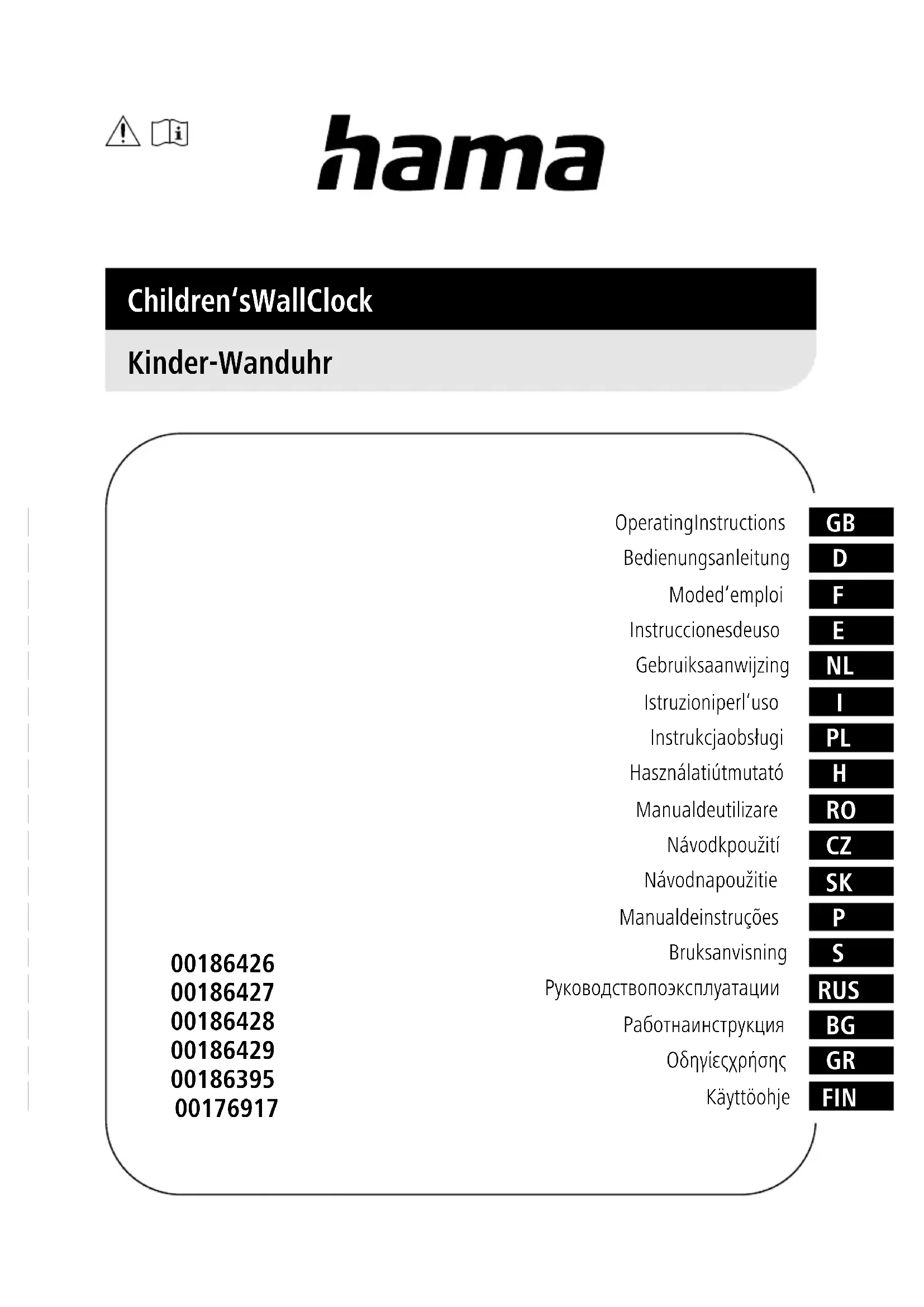 Kinder-Wanduhr Stromversorgung 1,5 V 1 x AA Batterie4 F Mode d‘emploi Nous vous remercions d’avoir choisi un produit Hama. Veuillez prendre le temps de lire l‘ensemble des remarques et consignes suivantes. Veuillez conserver ce mode d‘emploi à portée de main an de pouvoir le consulter en cas de besoin. Transmettez-le au nouveau propriétaire avec l’appareil le cas échéant.