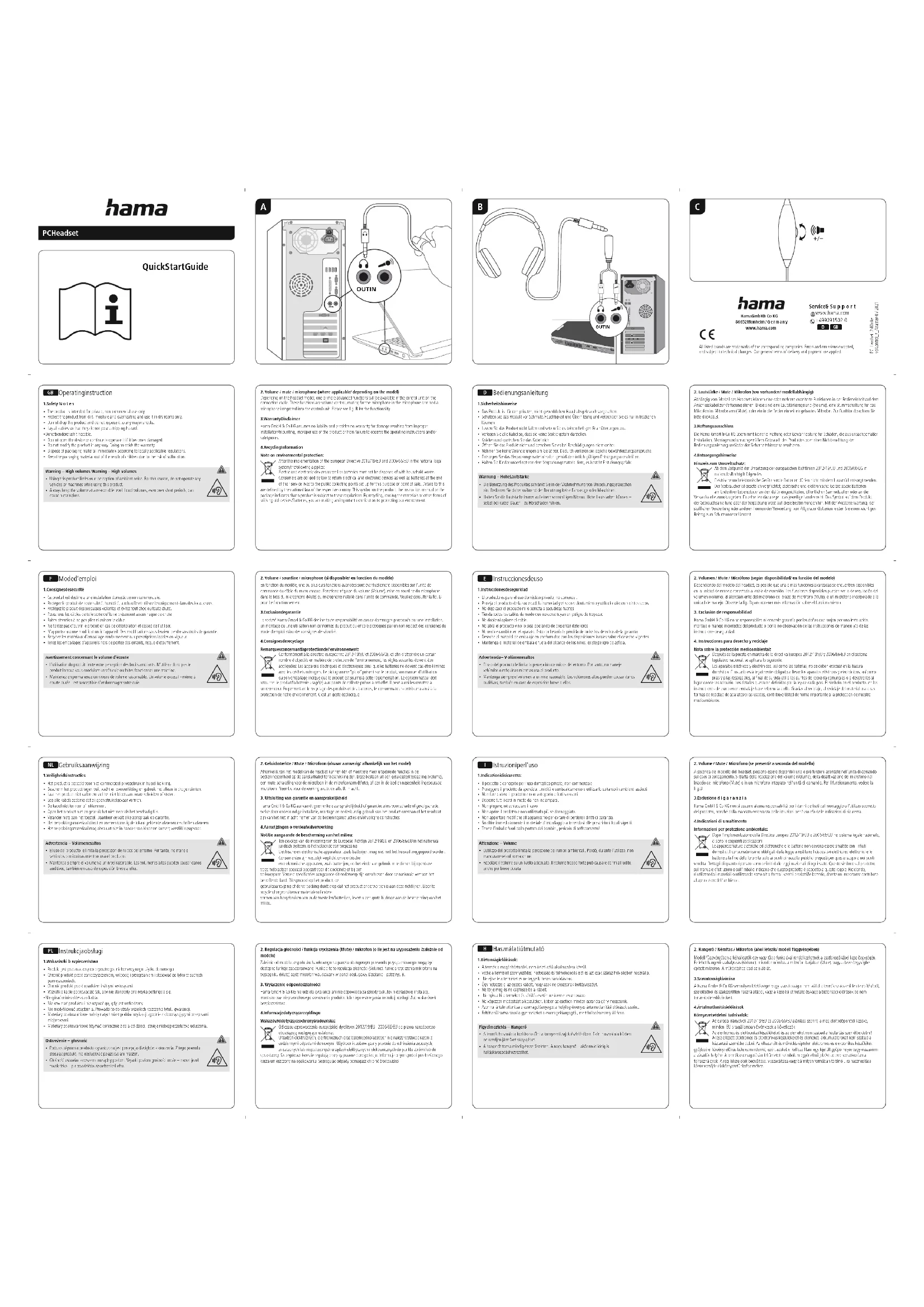En fonction du modèle,une ou plusieurs fonctionsavancées sont éventuellement disponiblessur l‘unité de commandeducâble du micro-casque. Fonctions: réglageduvolume(Volume),miseensourdine du microphone danslebrasdumicrophone(Mute) ou microphone installé dans l‘unitédecommande. Veuillez consulterlag. B pourlefonctionnement.3. Exclusion de garantie La société HamaGmbH&Co KG décline toute responsabilité en casdedommages provoqués parune installation, un montage ou uneutilisationnon conformes du produit ou encoreprovoqués par un nonrespectdes consignesdu moded‘emploi et/oudes consignesdesécurité.