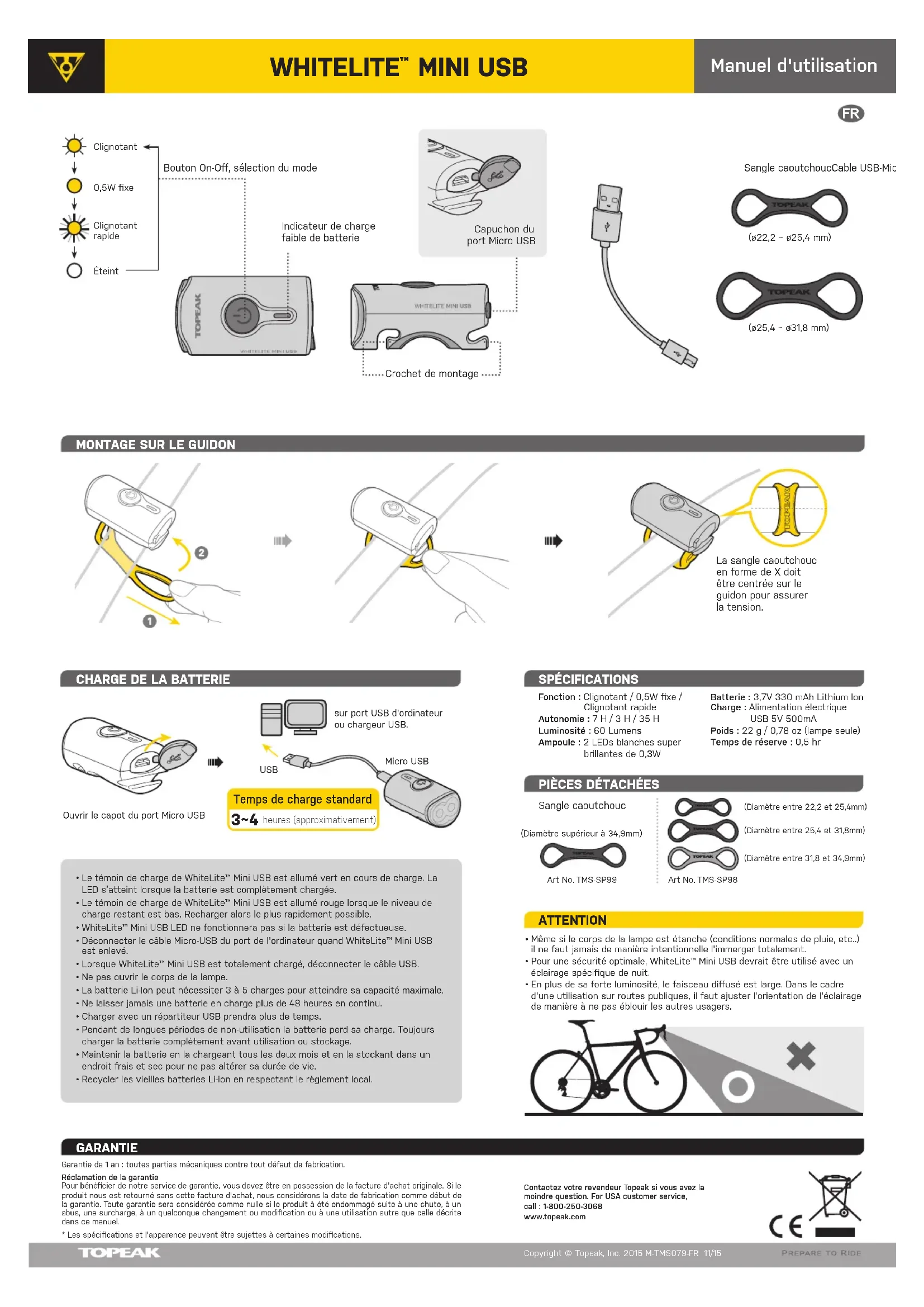 ClignotantGARANTIE0,5W fixeÉteintClignotant rapideBouton On-Off, sélection du modeCrochet de montageCapuchon du port Micro USBIndicateur de charge faible de batterieSangle caoutchoucCable USB-Micro USBCopyright © Topeak, Inc. 2015 M-TMS079-FR 11/15MONTAGE SUR LE GUIDON• Même si le corps de la lampe est étanche (conditions normales de pluie, etc..) il ne faut jamais de manière intentionnelle l'immerger totalement.• Pour une sécurité optimale, WhiteLite™ Mini USB devrait être utilisé avec un éclairage spécifique de nuit.• En plus de sa forte luminosité, le faisceau diffusé est large. Dans le cadre d'une utilisation sur routes publiques, il faut ajuster l'orientation de l'éclairage de manière à ne pas éblouir les autres usagers.ATTENTION Manuel d'utilisation WHITELITE