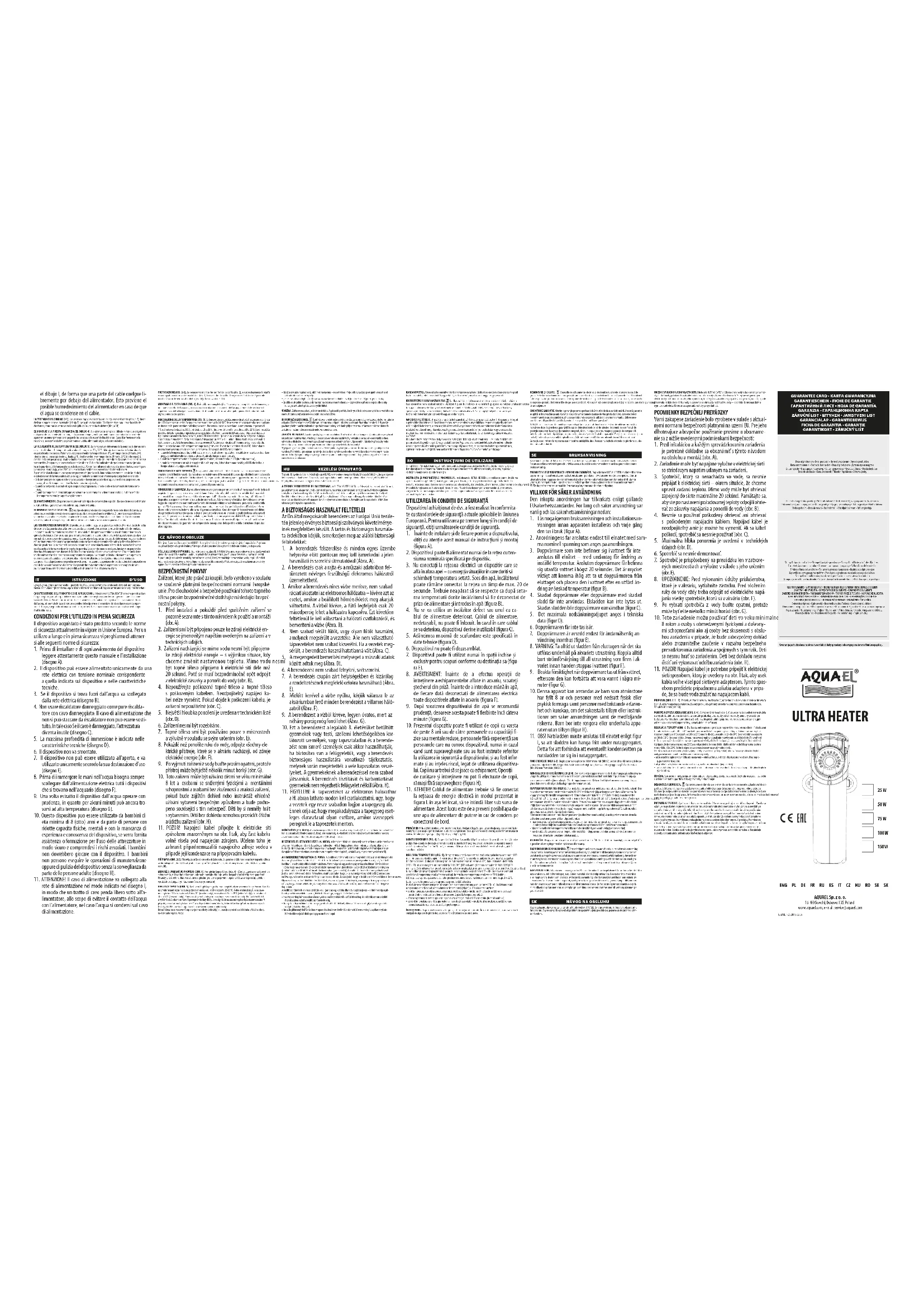 Chers Clients, nous vous remercions d'avoir acheté le produit d’AQUAEL. Nous sommes confiants que vous serez satisfait de son fonctionnement. Pour éviter un problème quelconque lié à son utilisation nous vous prions de bien vouloir prendre connaissance de la notice d’emploi ci-dessous. L’USAGE DU PRODUIT ET SES CARACTÉRISTIQUES. Les thermoplongeurs ULTRA HEATER servent à chauffer l’eau dans des aquariums d’eau douce et marins, paludariums et aquaterrariums ainsi que pour chauffer l’eau dans les bassins des terrariums. Ils possèdent un disjoncteur thermique de sécurité qui empêche le fonctionnement en dehors de l’eau, par exemple dans le cas de la cassure du récipient ou d’une fuite et de l’émersion du thermopoln-geur – l’appareil de met hors circuit automatiquement. Sa remise en marche se fera automatiquement lorsque la température aura baissé. LE CONDITIONS D’UTILISATION EN SÉCURITÉ L’appareil que vous venez d’acheter aété fabriqué en accord avec les normes de sécurité en vigueur sur le territoire de l’Union Européenne. Pour une utilisation de longue durée et en sécurité nous vous prions de prendre connaissance des consignes de sécurité ci-dessous mentionnées: