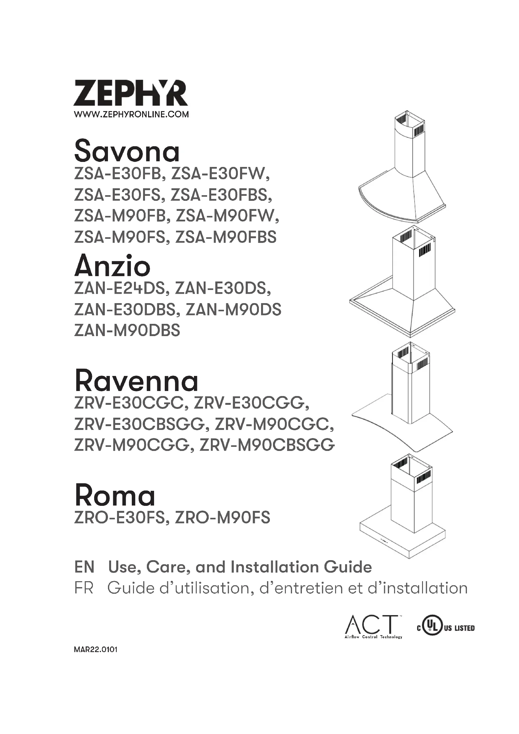 Pour commander des pièces, visitez-nous en ligne à http://store. zephyronline.com.31 ZSA, ZAN, ZRV, ZRO Guide d’utilisation, d’entretien et d’installation ZEPHYRONLINE.COM Garantie limitée Zephyr Ventilation, LLC (désigné aux présentes sous le nom de « nous ») garantit au premier acheteur (désigné aux présentes sous le nom de « vous » ou « votre ») de produits Zephyr (les « Produits ») que lesdits produits sont exempts de défauts de fabrication ou de main-d’œuvre selon les conditions suivantes : Garantie de trois ans sur les pièces : Garantie de trois ans à partir de la date d’achat originale du Produit. Nous fournirons sans frais les Produits ou les pièces (y compris les ampoules LED, le cas échéant) de remplacement qui com- portaient des défauts de fabrication. Nous pourrions choisir, à notre seule discrétion, de réparer ou de remplacer des pièces avant de prendre la décision de remplacer le Produit. Garantie limitée d’un an sur la main-d’œuvre : Garantie d’un an à partir de la date d’achat originale du Produit. Nous couvrirons sans frais les frais de main-d’œuvre afférents à la réparation du Produit ou des pièces de remplacement qui comportaient des défauts de fabrication. Un an après la date d’achat originale, vous serez responsable de tous les frais de main-d’œuvre associés à la présente garantie. Exclusions de la garantie : Cette garantie ne couvre que la réparation ou le remplacement, à notre gré, de pièces ou de Produits défectueux et ne couvre aucun autre coût afférent aux Produits, dont, sans s’y limiter, les frais liés : (a) à l’entretien normal des Produits et au remplacement des pièces consommables, comme les fluorescent, incandescence ou halogèneampoules, les filtres métalliques, les filtres à charbon et les fusibles; (b) à tout Produit ou pièce ayant été endommagé durant le transport ou étant le résultat d’un mauvais usage, d’une négligence, d’un accident, d’une installa- tion incorrecte ou ne respectant pas les notices d’installation recommandées, d’un entretien ou d’une réparation inap- proprié (dont ne nous sommes pas responsables); (c) à une utilisation commerciale ou ne correspondant pas à l’utilisa- tion pour laquelle les Produits sont conçus; (d) à l’usure naturelle du fini, à l’usure due à un entretien inadéquat, à l’utili- sation de produits nettoyants corrosifs ou abrasifs, de tampons nettoyeurs et de produits de nettoyage pour le four; (e) aux éclats, entailles ou fissures résultant d’un abus ou d’une mauvaise utilisation du Produit; (f) aux déplacement d’un technicien de service à votre domicile pour vous montrer comment utiliser les Produits; (g) aux dommages causés par un accident, un incendie, une inondation, un cas fortuit; ou (h) Les installations personnalisées ou modifications qui ont un impact maintenabilité du Produit. Si vous vous trouvez à l’extérieur du territoire que nous desservons, des frais supplémentaires pourraient s’appliquer pour la livraison des produits à nos points de service désignés pour une répara- tion sous garantie ou vous pourriez avoir à débourser les frais de déplacement du technicien à votre domicile pour que le Produit soit réparé, enlevé ou réinstallé. Un an après la date d’achat originale du Produit, vous êtes également responsable de tous les frais de main-d’œuvre associés à la présente garantie.Restrictions de la garantie. NOTRE OBLIGATION DE RÉPARER OU DE REMPLACER, À NOTRE GRÉ, LE PRODUIT CONSTITUE VOTRE SEUL ET UNIQUE RECOURS SOUS LA PRÉSENTE GARANTIE. NOUS NE NOUS PORTONS PAS RESPONSABLES POUR TOUT DOMMAGE INDIRECT, ACCESSOIRE OU PARTICULIER RÉSULTANT OU AYANT UN LIEN AVEC L’UTILISATION OU LE RENDEMENT DES PRODUITS. LES GARANTIES EXPRESSES DE LA SEC-TION PRÉCÉDENTE SONT EXCLUSIVES ET TIENNENT LIEU DE TOUTE AUTRE GARANTIE EXPRESSE. PAR LES PRÉSENTES, NOUS REJETONS ET EXCLUONS TOUTE AUTRE GARANTIE EXPRESSE POUR LES PRODUITS ET TOUTES LES GARANTIES TACITES PRÉVUES PAR LA LOI, DONT CELLES RELATIVES À LA QUALITÉ MARCHANDE OU À L'ADÉQUATION DU PRODUIT POUR UNE UTILISATION PARTICULIÈRE. Certains États ou provinces n’autorisent pas les restrictions sur la durée d’une garantie implicite ou l’exclusion ou la restriction des dommag- es indirects ou accessoires; par conséquent, les exclusions et restrictions mentionnées ci-dessus pourraient ne pas s’appliquer à votre cas. Dans la mesure où une loi applicable interdit l’exclusion de garanties implicites, la durée de toute garantie implicite applicable se limite à la période de deux ans décrite ci-dessus. L’unique objectif de toute descrip- tion orale ou écrite est de présenter les Produits et celle-ci ne devrait pas être interprétée comme une garantie expresse. Avant d’utiliser ou de permettre l’utilisation des Produits, vous devrez déterminer si les Produits conviennent aux utilisa- tions prévues et vous devrez assumer tout risque et toute responsabilité relatifs à ces utilisations. Nous nous réservons le droit d’utiliser des pièces reconstruites ou remises à neuf pour remplacer l’une des fonctionnalités dans le cadre de la présente garantie ou de l’une des parties de la présente garantie. L’acheteur original ne peut transférer la présente garantie et celle-ci n’est valide qu’aux États-Unis et au Canada. Pour obtenir du service sous la garantie : Pour avoir droit à du service sous garantie, vous devez : (a) nous avertir en utilisant l’adresse ou le numéro de téléphone inscrit ci-dessous dans les soixante jours suivant la détection du défaut; (b) donner le numéro du modèle, le numéro d’identification de la pièce ainsi que le numéro de série; et (c) décrire la nature de tout défaut de la pièce ou du Produit. Au moment de faire la demande de service sous garantie, vous devrez présenter votre preuve d’achat et la preuve de la d
