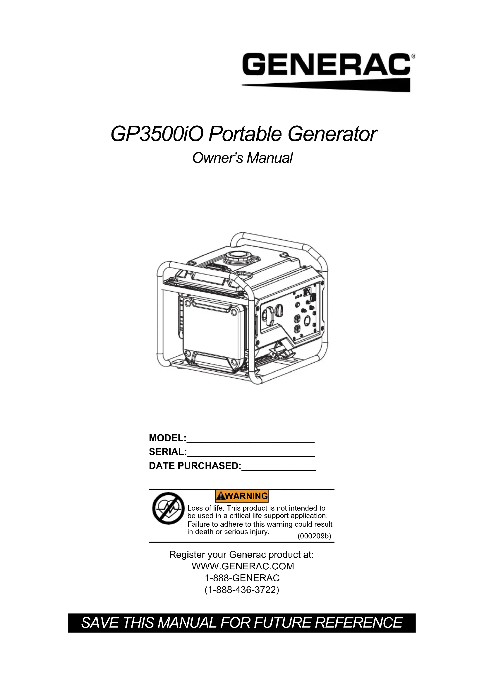 (000209b) Danger de mort. Ce produit doit être utilisé dans une application critique de support de vie. Le non-respect de cet avertissement peut entraîner la mort ou des blessures graves. AVERTISSEMENT Enregistrez votre produit Generac sur le site Internet :
