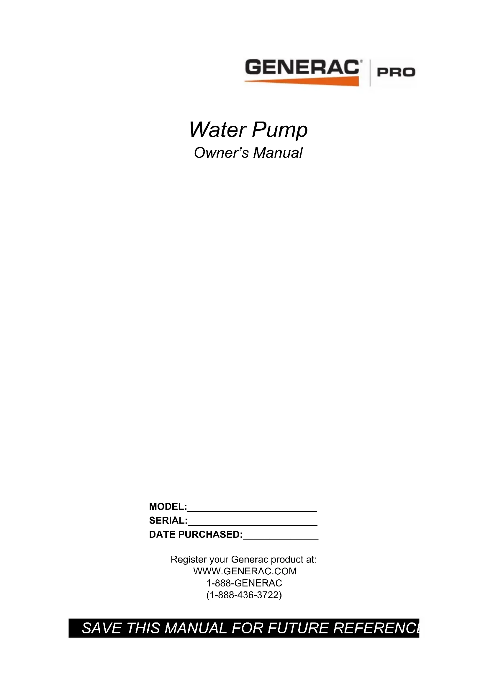Bien connaître votre pompe à eau Lisez ce manuel avec attention avant d’assembler et d’utiliser cet équipement. Conservez ce manuel pour référence ultérieure. Vous pouvez vous procurer des exemplaires de remplacement du manuel du propriétaire sur www.generac.com