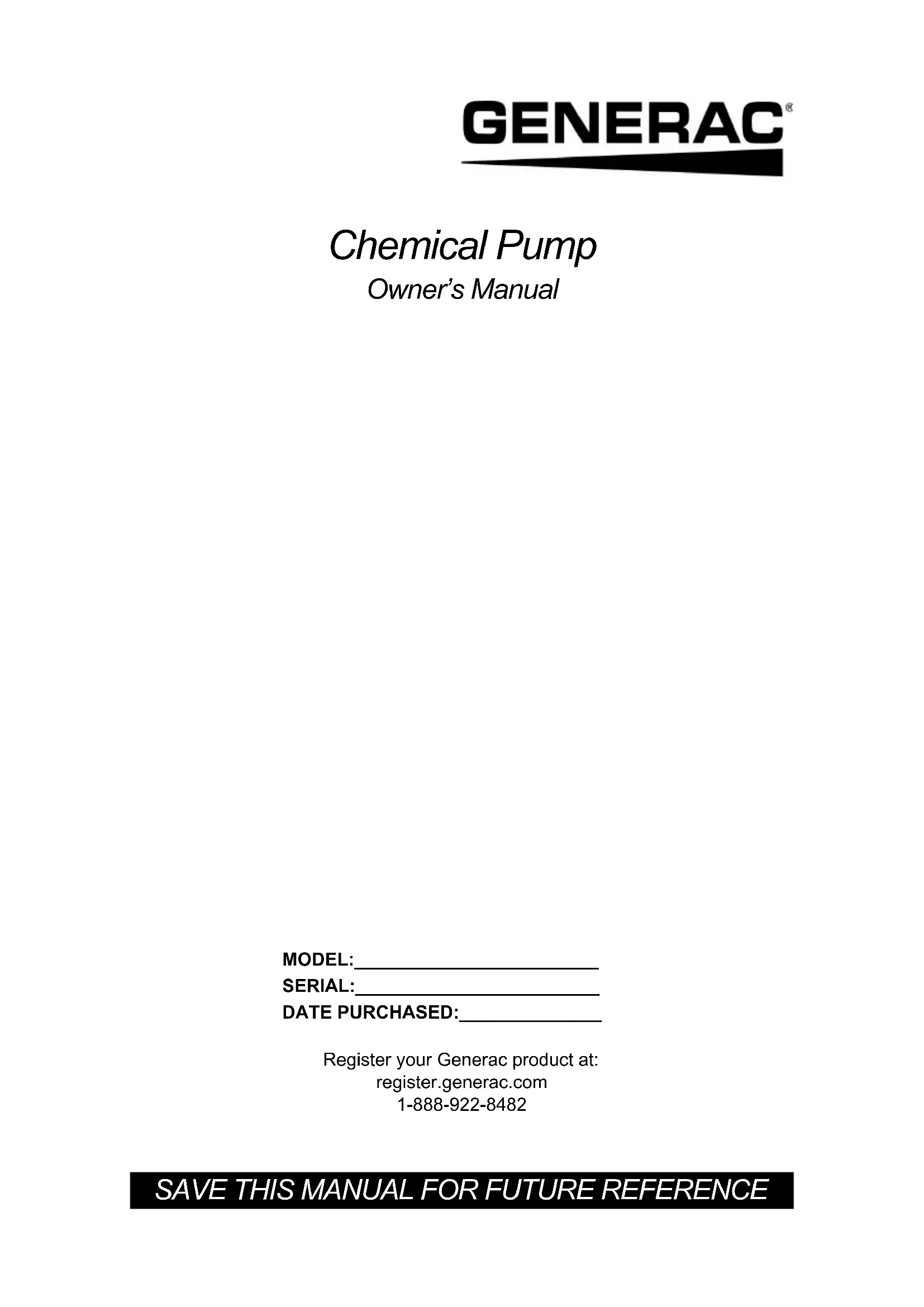 - Le joint mécanique peut être endommagé du fait de l’usure normale, d’une surchauffe, du pompage de liquides incompatibles ou d’une utilisation à vide de la pompe. ** Une usure excessive de l’impulseur résulte essentiellement de la cavitation. La cause peut en être une aspiration restreinte ou une hauteur d’aspiration trop élevée. *** La hauteur d’aspiration totale ne doit pas dépasser 26 pieds (8 mètres). PROBLÈME CAUSE CORRECTION16 Manuel du propriétaire de pompe à produits chimiques RemarquesManuel du propriétaire de pompe à produits chimiques 17Réf. 10000014547 Rév. B 17/10/2018 ©2018 Generac Power Systems, Inc. Tous droits réservés. Les spécifications sont sujettes à modification sans préavis. Aucune forme de reproduction n’est autorisée sans le consentement écrit préalable de Generac Power Systems Inc. Generac Power Systems, Inc. S45 W29290 Hwy. 59 Waukesha, WI 53189 1-888-GENERAC (1-888-436-3722) www.generac.com